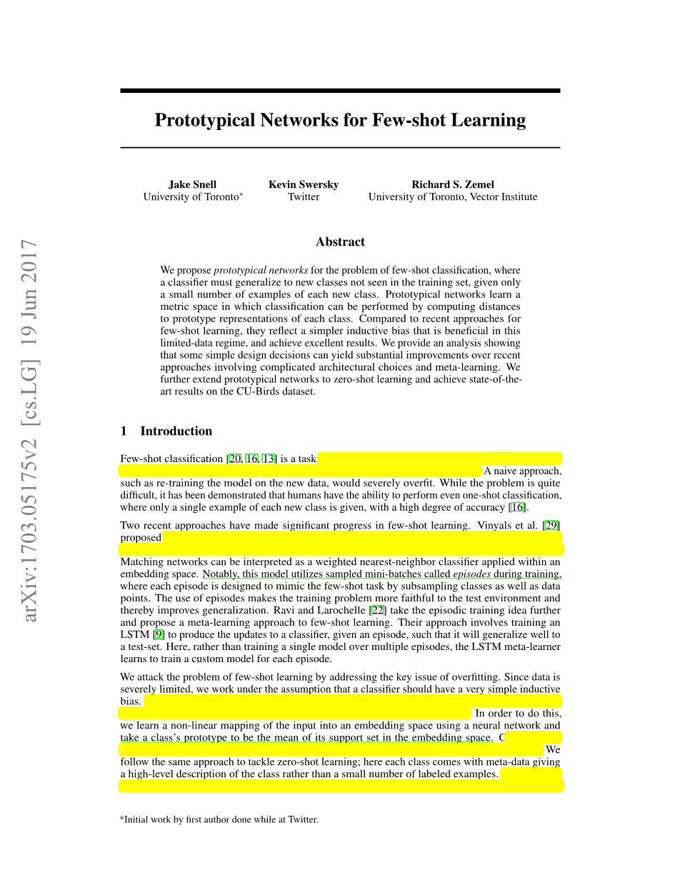 我们通过解决过度拟合的关键问题来解决少样本学习问题。因为数据受到严格限制,所以我们假设分类器应具有非常简单的归纳偏差。我们的方法是原型网络,它是基于嵌入的即同一类的样本都聚集在每个类的原型周围。为了做到这一点,我们使用神经网络将输入非线性映射到嵌入空间,然后将类的原型作为其在嵌入空间中支持集的平均值。然后,通过简单地找到最近的类原型,对嵌入的查询点执行分类。我们采用相同的方法来解决零样本学习问题; 这里的每个类都带有元数据,提供了类的高级描述,而不是少量的标记示例。因此,我们学习将元数据嵌入到共享空间中,以作为每个类的原型。
