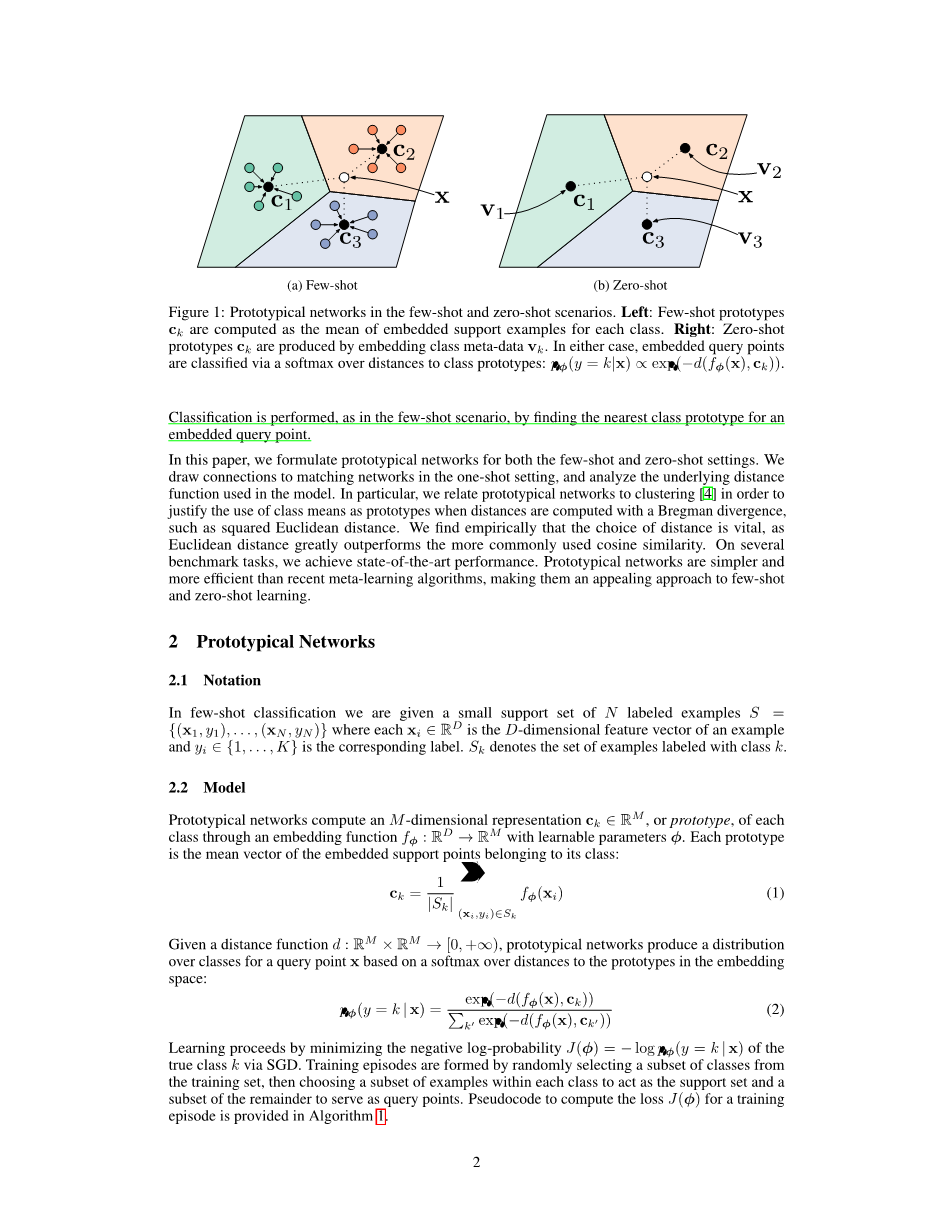 图1:在少样本和零样本环境中的原型网络。左边:几个原型被计算为每个类的嵌入支持示例的平均值。右边:通过嵌入类元数据产生零样本原型。在任何一种情况下,嵌入的查询点通过softmax在距离上分类到类原型:。
