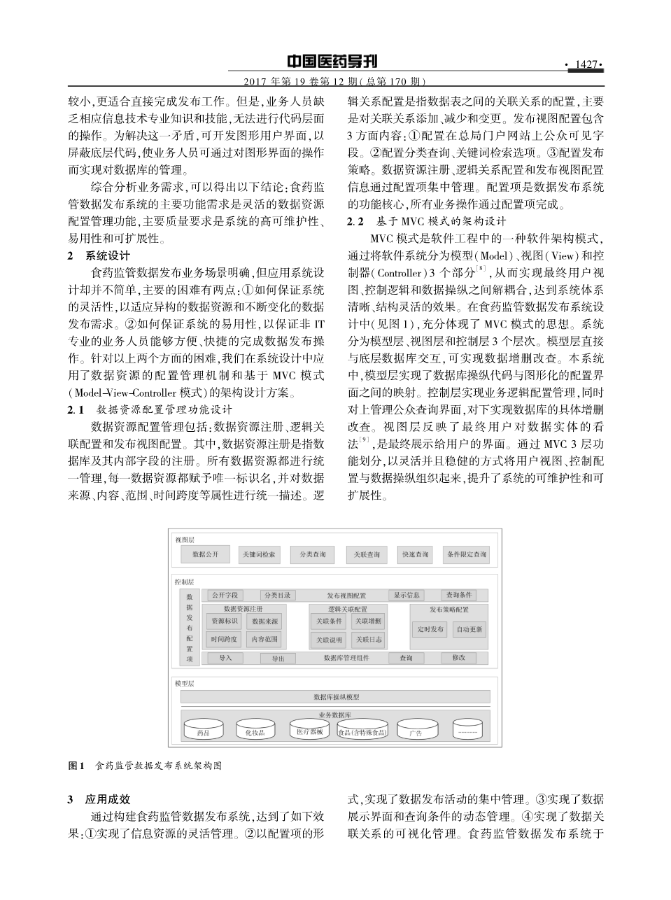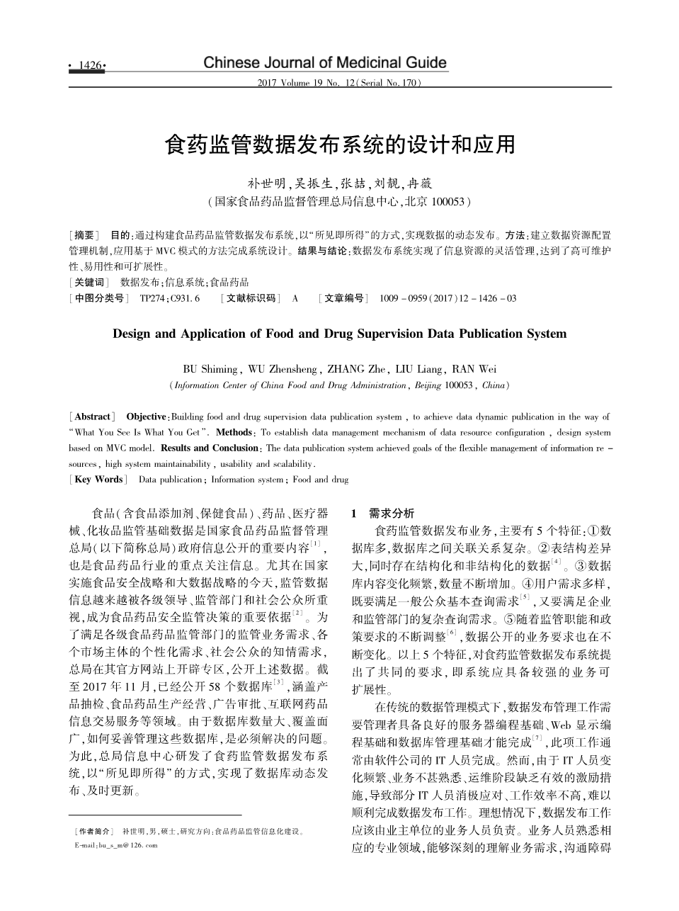 [Abstract] Objective:Building food and drug supervision data publication system, to achieve data dynamic publication in the way of “What You See Is What You Get ”. Methods: To establish data management mechanism of data resource configuration, design system based on MVC model. Results and Conclusion:The data publication system achieved goals of the flexible management of information re – sources, high system maintainability, usability and scalability.