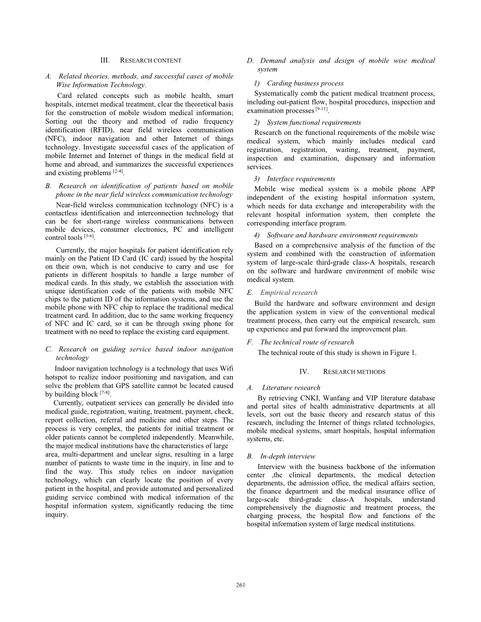 移动健康,智能医院,网络医疗等卡片相关概念,为移动智慧医疗信息的建设明确了理论依据,梳理射频识别(RFID)、近场无线通信(NFC)、室内导航等物联网技术的理论和方法。调查国内外医学领域移动互联网和物联网应用的成功案例,总结成功经验和存在的问题[2-4]