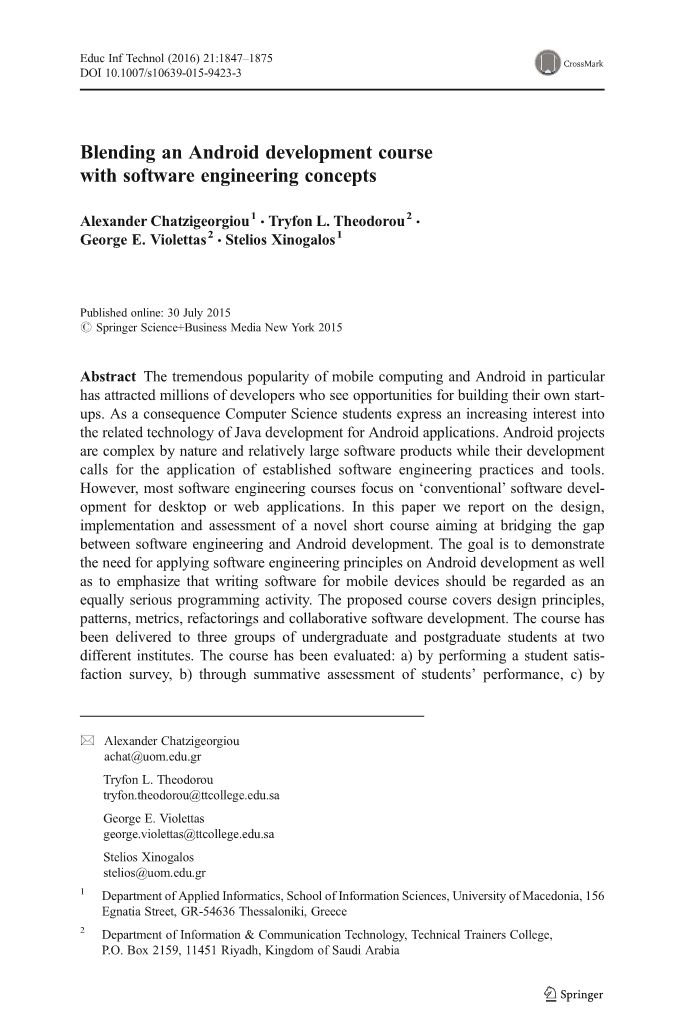摘要: 移动计算和安卓的大受欢迎吸引了数以百万计的想要开创自己事业的开发人员。导致了计算机科学的学生们对用Java开发安卓应用程序表现出越来越大的兴趣。Android项目在开发过程中市很复杂的,并且软件产品对应用已建立的软件工程实践和工具要求很大。但是,大部分的软件工程课程的重点市桌面或者web应用程序的“常规”软件开发。在这篇论文中,我们报告了关于实现和评估一个旨在缩小软件工程和安卓开发之间差距的新的课程设计。我们的目标是在Android开发上应用软件工程原则的必要性,要强调的是,为移动设备编写软件应该被视为一种同样重要的编程项目。课程内容包括了设计原则,模式、度量、重构和协作软件开发。这门课程已经被送到三组本科生和两组研究生课程。这门课程已经被评估过了:a)通过学生满意度的调查,b)通过学生表现的总结性的评估,c)通过调查这门课程是否改变了学生的职业兴趣,d)通过对基于“金砖四国”的同行进行评估。结果表明,这样的短期课程也能提高学生们对安卓开发的兴趣,使他们意识到软件工程概念再移动领域和应用程序软件开发上的重要性。