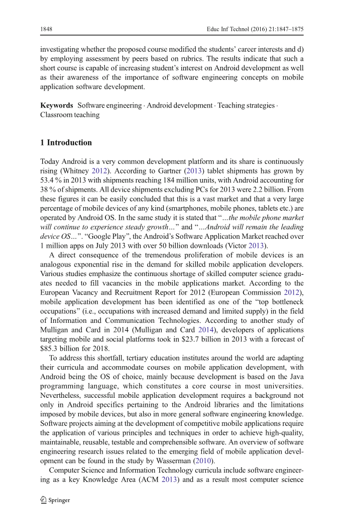 为了弥补这一不足,世界各地的高等教育机构正在进行调整他们的课程,适应移动应用程序开发的课程。Android成为操作系统的选择的主要原因市基于java的开发编程语言市大多数大学的核心课程。然而,成功的移动应用程序需要的不仅仅是Android库和Android库中由移动设备来实施,还需要更一般的软件工程知识。软件项目旨在利用各种原则和技术来开发出可维护的、可重用的、可测试的和可理解的具有竞争力的移动应用程序。软件工程楷书沃塞曼在研究中发现了与移动应用程序开发领域相关的工程研究问题。(2010)