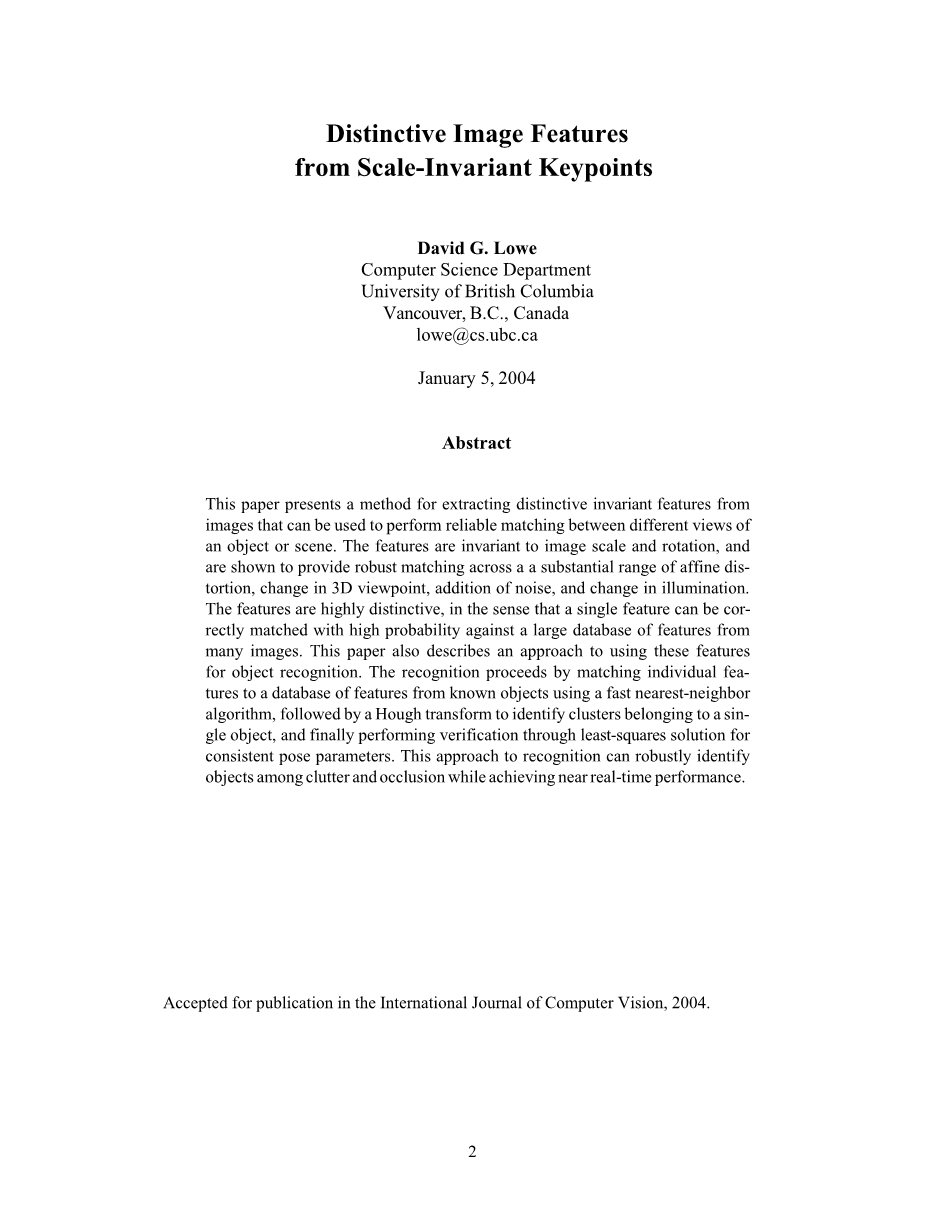 基于尺度不变关键点的图像特征外文翻译资料 2023-01-28 11:34:12 英语原文共 28 页,剩余内容已隐藏,支付完成后下载完整资料 英语译文共 59 页,剩余内容已隐藏,支付完成后下载完整资料 资料编号:[254382],资料为PDF文档或Word文档,PDF文档可免费转换为Word 原文和译文剩余内容已隐藏,您需要先支付 30元 才能查看原文和译文全部内容!立即支付 发小红书推广免费获取该资料资格。点击链接进入获取推广文案即可: Ai一键组稿 | 降AI率 | 降重复率 | 论文一键排版 PREVIOUS NEXT 您可能感兴趣的文章 管理信息系统外文翻译资料 老年人的营养和营养需求外文翻译资料 试卷自动生成系统的设计与实现外文翻译资料 JSP的技术发展历史外文翻译资料 微软.NET平台的介绍外文翻译资料 设置一个Servlet和JSP环境外文翻译资料 Java Servlet外文翻译资料 基于递归神经网络的会议识别语言建模外文翻译资料 基于社区结构的推荐算法和用户的信任外文翻译资料 边缘路径绑定:一种不太模糊的边缘绑定方法外文翻译资料