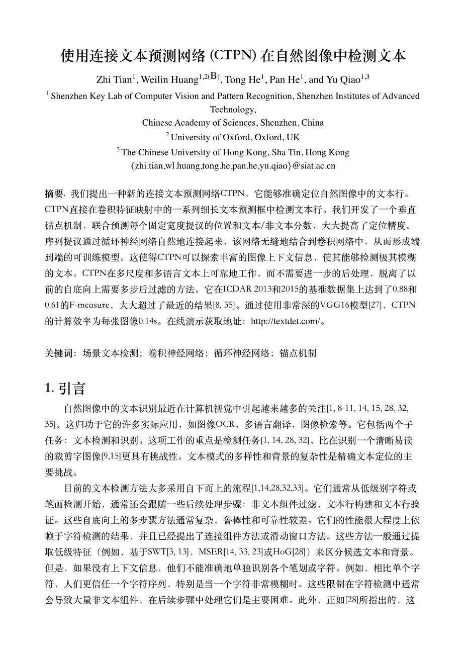 使用连接文本预测网络(CTPN)在自然图像中检测文本外文翻译资料 2023-02-07 09:33:19 英语原文共 17 页,剩余内容已隐藏,支付完成后下载完整资料 英语译文共 14 页,剩余内容已隐藏,支付完成后下载完整资料 资料编号:[259319],资料为PDF文档或Word文档,PDF文档可免费转换为Word 原文和译文剩余内容已隐藏,您需要先支付 30元 才能查看原文和译文全部内容!立即支付 发小红书推广免费获取该资料资格。点击链接进入获取推广文案即可: Ai一键组稿 | 降AI率 | 降重复率 | 论文一键排版 PREVIOUS NEXT 您可能感兴趣的文章 管理信息系统外文翻译资料 老年人的营养和营养需求外文翻译资料 试卷自动生成系统的设计与实现外文翻译资料 JSP的技术发展历史外文翻译资料 微软.NET平台的介绍外文翻译资料 设置一个Servlet和JSP环境外文翻译资料 Java Servlet外文翻译资料 基于递归神经网络的会议识别语言建模外文翻译资料 基于社区结构的推荐算法和用户的信任外文翻译资料 边缘路径绑定:一种不太模糊的边缘绑定方法外文翻译资料