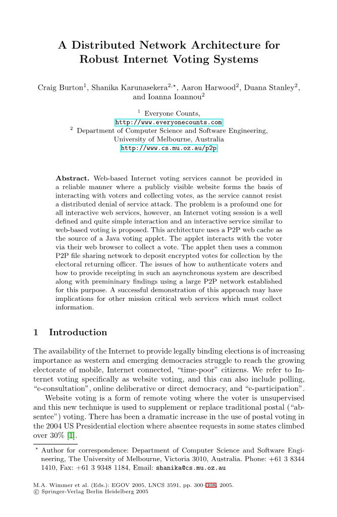 摘要:基于web的Internet投票服务无法以可靠的方式提供,因为在这种情况下,公开可见的网站构成了与投票者交互和收集选票的基础,因为该服务无法抵抗分布式拒绝服务攻击。这个问题对于所有的交互式web服务来说都是一个深刻的问题,然而,互联网投票会话是一个定义良好且非常简单的交互,一个类似于基于web的投票的交互式服务被提出了。该架构使用P2P网络缓存作为Java投票小程序的来源。小程序通过他们的网页浏览器与投票者交互来收集选票。然后,小程序使用一个公共的p2p文件共享网络储存加密的选票,供选举选举干事收集。如何在这样一个异步系统中验证选民和提供接收的问题,以及使用为此目的建立的大型P2P网络的初步发现,都被描述了。该方法的成功演示可能会对其他必须收集信息的关键任务web服务产生影响。