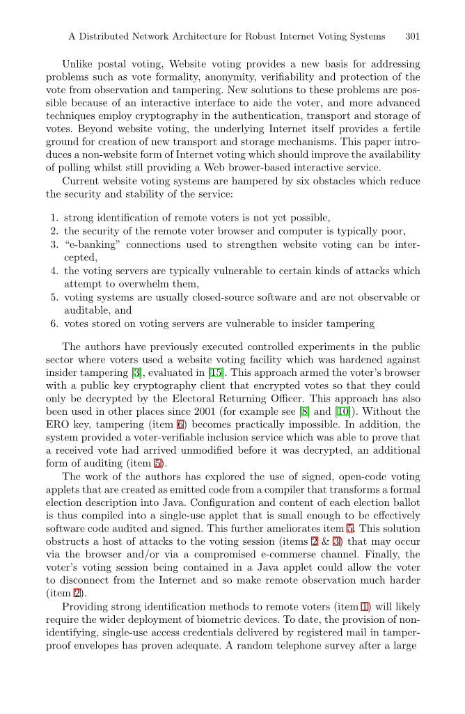 作者之前在公共部门进行了控制实验,选民使用了一个网站投票设施,该设施加强了内部干预[3],在[15]中评估。这种方法为选民的浏览器配备了一个公钥加密客户端,该客户端对选票进行加密,因此只有选举选举干事才能解密这些选票。自2001年以来,这种方法也在其他地方使用(例如,参见[8]和[10])。没有ERO密钥,篡改(项目6)实际上是不可能的。此外,该系统提供了一个选民可验证的包含服务,它能够证明收到的选票在被解密之前没有被修改,这是一种额外的审计形式(项目5)。