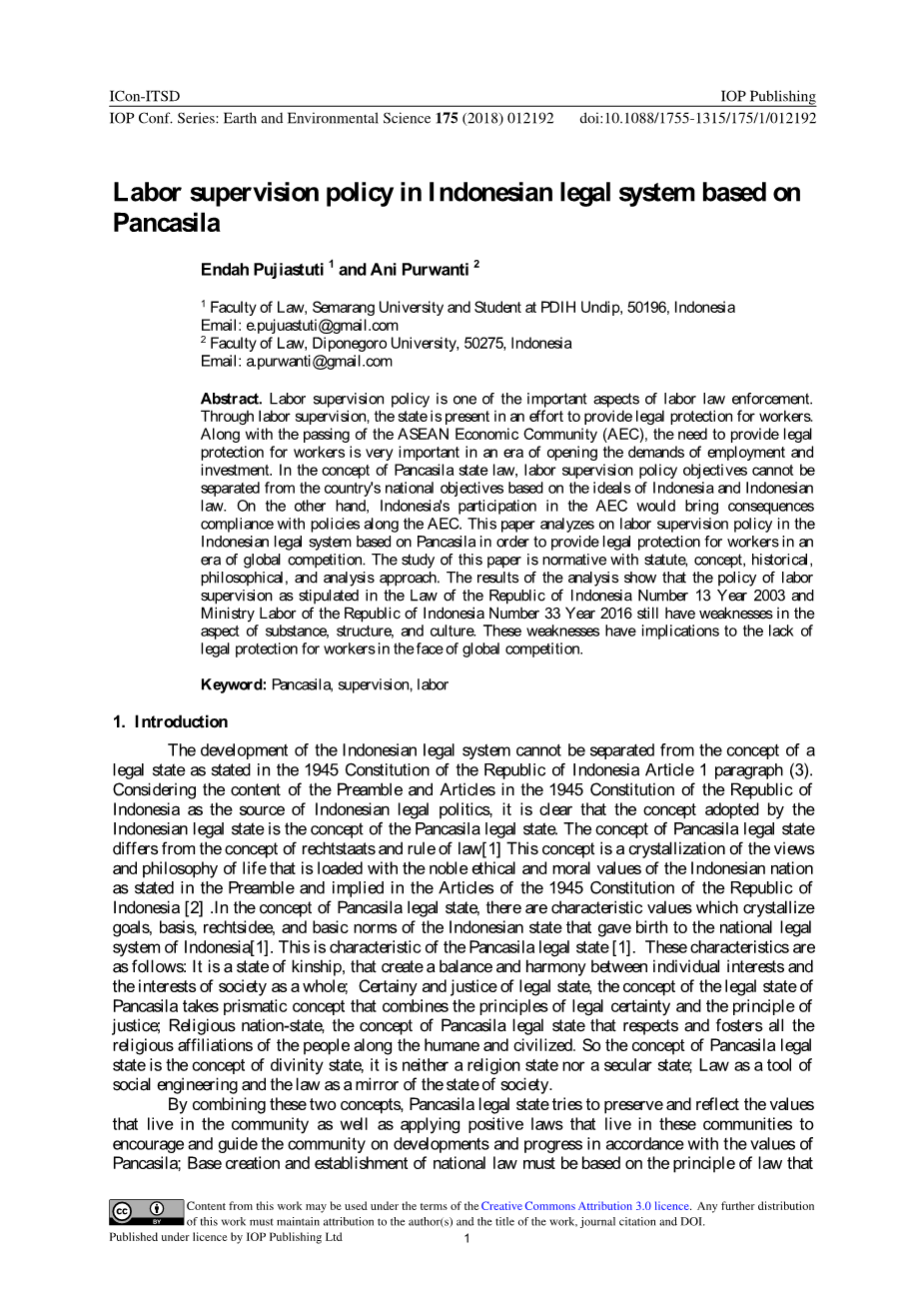 监督是法治的一个重要方面,甚至成为为避免滥用权力而必须存在的支柱之一。正如胡森颂所引用的卡尔·洛温斯坦。所述,这种监督方面是法治和民主概念中的一个基本要素(胡森颂,2005)。基于法律国家的概念,劳动监督政策不能脱离以潘卡西拉为基础的印度尼西亚法律制度的发展背景。确实有必要进行劳动监督,以确保符合工人和雇主利益的就业政策的实施,并为工人提供保护,鼓励企业业绩,改善整个社会的福利。这些问题将变得毫无意义,因为工作规范中的实质性监管以及监督的结构和文化方面存在缺陷。