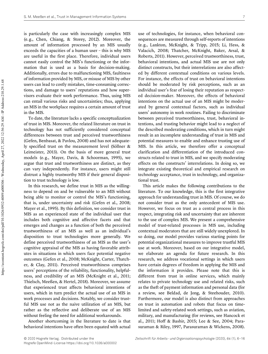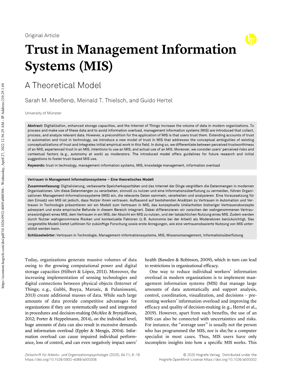 如今,由于计算能力和数字存储容量的增长,组织产生了大量数据(Hilbert amp; Loacute;pez,2011)。此外,传感技术的日益实施和物理对象之间的数字连接(物联网;例如,Gubbi、Buyya、Marusic 和 Palaniswami,2013年)创造了额外的大量数据。如果在程序和决策中系统地使用和集成如此大量的数据,则可以为组织提供竞争优势(McAfee amp; Brynjolfsson,2012 年;Porter和Heppelmann,2014 年),但在个人层面,大量数据也可能导致过度需求和信息过载。信息过载会导致个人表现受损、失控,甚至会对用户的健康产生影响(Bawden amp; Robinson, 2009),这反过来又会导致组织效能的限制。在现代组织中,减少单个员工信息过载的一种方法是实施管理信息系统 (MIS),该系统自动管理大量数据并支持分析、控制、协调、可视化和决策——防止员工信息过载并提高决策的效率和质量(例如Hertel 等人,2019)。然而,除了这些好处之外,MIS的使用也可能与不确定性和风险有关。例如,“普通用户”通常不是编写MIS的人,在大多数情况下也不是计算机专家。因此,MIS 用户对特定MIS的工作方式只有不完整的了解。这对于日益复杂的MIS尤其如此(例如,Chen、Chiang和Storey,2012年)。此外,MIS处理的信息量通常超过人类用户的能力——这就是MIS有用的原因。因此,个人用户无法轻控制 MIS 的功能或用作决策基础的信息。此外,由于MIS故障、MIS提供的信息错误或其他用户滥用 MIS 导致的错误可能导致代价高昂的错误、耗时的纠正,以及损害用户声誉和主管评估其工作绩效的方式。因此,使用MIS可能会带来各种风险和不确定性;因此,在工作场所应用MIS需要对MIS有一定的信任。