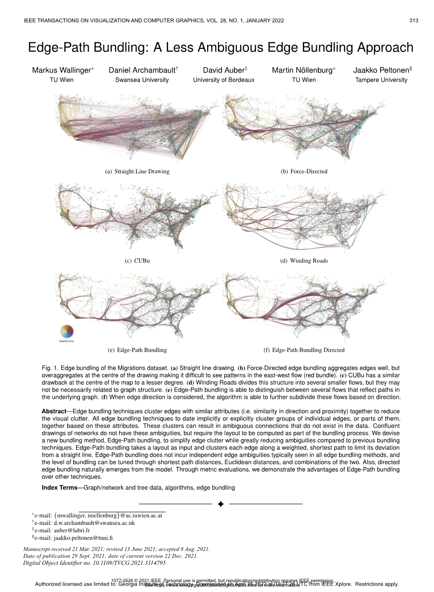 抽象边缘捆绑技术将具有相似属性(即方向相似性和接近性)的边缘聚集在一起,以减少视觉混乱。迄今为止,所有边缘捆绑技术都基于这些属性隐式或显式地将单个边缘组或其部分聚集在一起。这些集群可能会导致数据中不存在的不明确连接。合流网络图没有这些模糊性,但需要在捆绑过程中计算布局。我们设计了一种新的捆绑方法,即边缘路径捆绑,以简化边缘杂波,同时与以前的捆绑技术相比,大大减少了模糊度。边路径绑定将布局作为输入,并沿加权最短路径对每条边进行聚类,以限制其偏离直线。边缘路径绑定不会产生所有边缘绑定方法中常见的独立边缘模糊性,绑定级别可以通过最短路径距离、欧几里德距离以及两者的组合进行调整。此外,定向边缘捆绑自然地从模型中出现。通过度量评估,我们展示了边缘路径绑定相对于其他技术的优势。