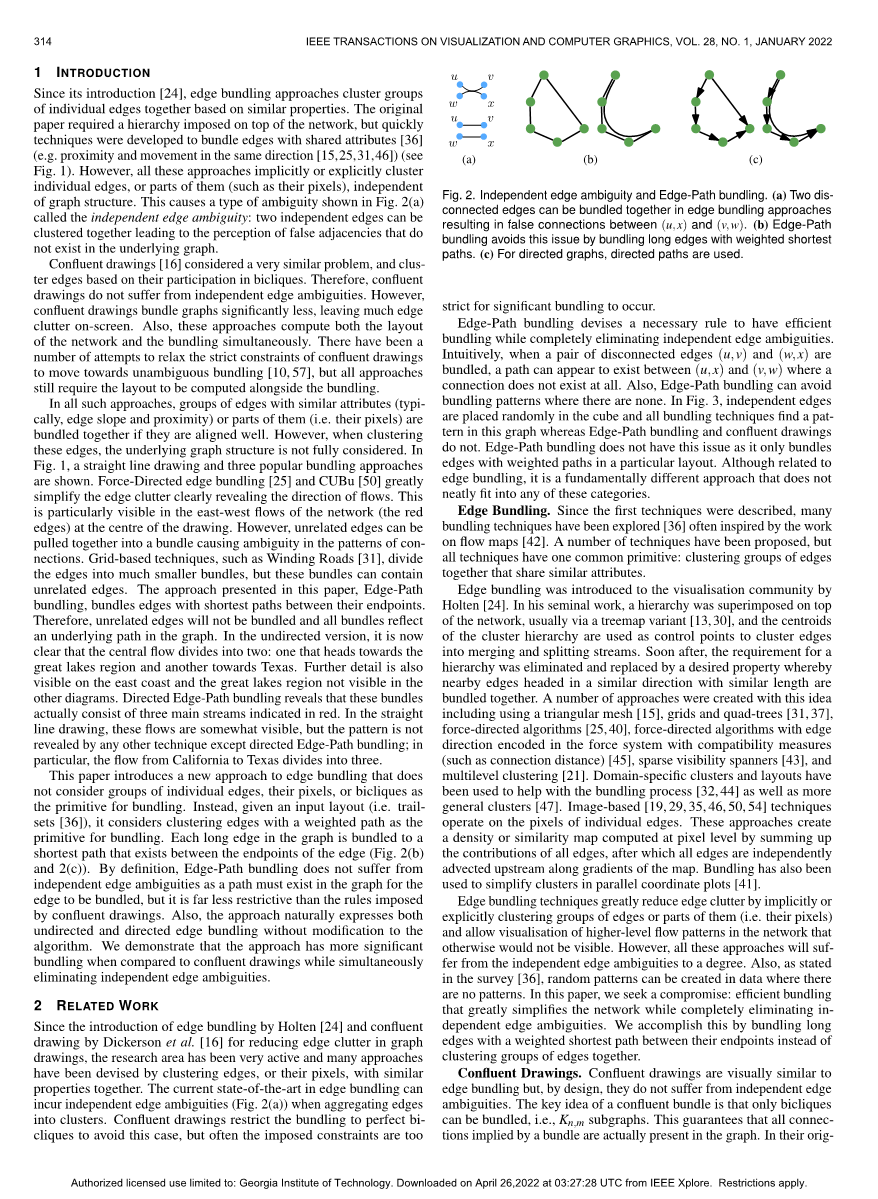 本文介绍了一种新的边缘绑定方法,该方法不考虑单个边缘组、它们的像素或双色作为绑定的原语。相反,给定一个输入布局(即trailsets[36]),它将带加权路径的聚类边视为捆绑的原语。图中的每条长边被捆绑到边端点之间的最短路径(图2(b)和图2(c))。根据定义,边路径绑定不受独立边模糊性的影响,因为要绑定边,图中必须存在一条路径,但它的限制性远低于合流图形施加的规则。此外,该方法自然地表达了无向和有向边缘捆绑,而无需修改算法。我们证明,与合流图形相比,该方法具有更显著的捆绑效果,同时消除了独立的边缘歧义。