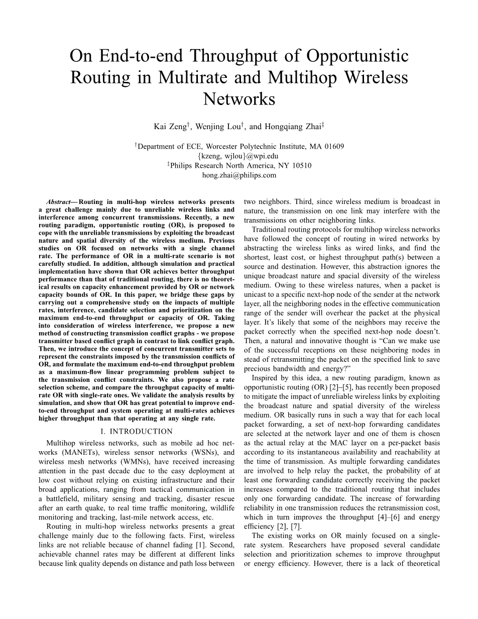 摘要——由于无线链路的不可靠性和并发传输的干扰,在多跳无线网络中进行路由是一个巨大的挑战。最近提出了一个新的路由模型,即机会路由(OR),它可以利用无线媒介的广播特性和空间分集性来处理不可靠传输。关于OR的现有研究都是关于单信道速率的网络,而OR在多速率方案下的性能还没有被研究过。此外,尽管模拟仿真和实际运行都显示OR比传统路由有更好的表现,但是还没有关于OR所带来的容量提升或OR的网络容量界限的研究结果。在这篇论文中,我们带来了关于多速率、干扰、候选节点选择和优先级设置对OR的端到端最大吞吐量的影响的详尽研究。考虑到无线干扰,我们提出了一个新的方法来构造传输干扰图——我们对比链路冲突图提出了基于传输节点的冲突图。我们引入了并发传输节点集合的定义,来表示OR中传输冲突所带来的限制。然后我们根据传输冲突的限制,将最大化端到端吞吐量的问题规划为一个最大化流的线性规划问题。我们还提出了一个速率选择机制,并将多速率OR的吞吐量与单速率OR进行了比较。最后,我们通过模拟仿真证实了我们的分析结果,结果显示OR在提升端到端吞吐量上有巨大的潜能,并且系统在多速率情况下可以实现比单速率情况更高的吞吐量。