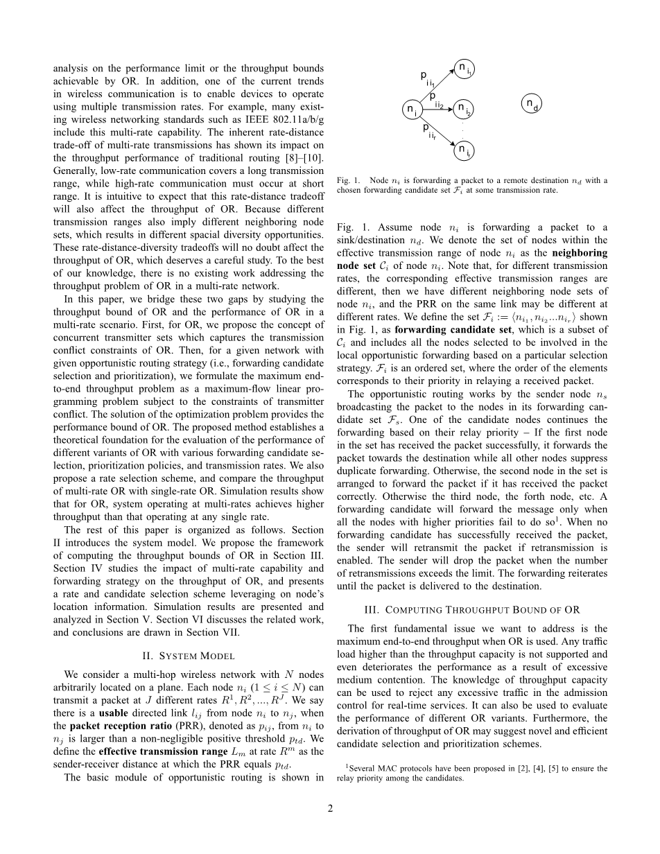 现有的关于OR的研究主要聚焦于单速率系统。研究学者们提出了许多候选节点选择和优先级设置机制来提高吞吐量或能量效率。然而,缺少对OR可实现的性能界限或吞吐量界限的理论研究。此外,在无线通信中的一个现有趋势是让设备用多种传输速率运转。例如,许多现有的无线网络标准,比如IEEE 802.11a/b/g,都包括多速率性能。在多速率传输中固有的速率和距离之间的权衡对传统路由吞吐量性能有影响[8]-[10]。事实上,低速率传输的覆盖半径都比较大,同时高速率传输都是在近范围内发生。我们自然而然地想到,速率和距离之间的权衡可能也会影响OR的吞吐量。因为不同的传输范围也意味着不同的邻居节点集合,这就会带来不同的空间分集机会。速率、距离和多样性之间的权衡无疑会影响OR的吞吐量,这值得仔细研究。在我们所知范围内,目前还没有解决多速率网络中OR吞吐量问题的研究。