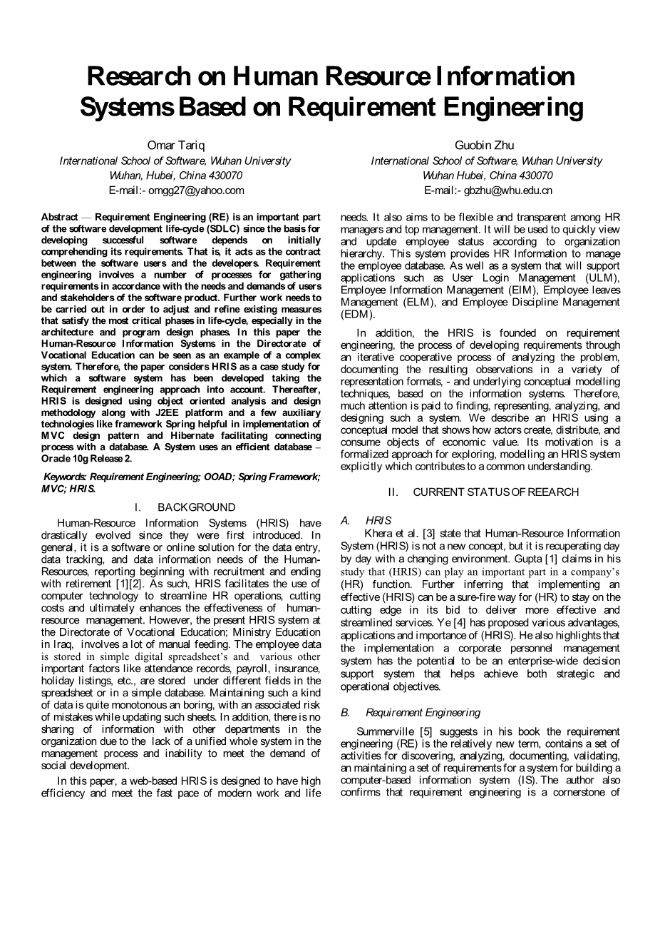This study follows the requirement engineering approach in analysis, design, and life-cycle of a web-based HRIS system. The approach determines the Requirement Specification, Requirement Analysis, and System Design approach, which is based on the specifications of the Unified Modeling Language (UML) [8]. It starts with a phase called requirements capture, during which we define use cases and scenarios. The goal of the requirements capture phase is to establish some common ground between the developers and the users by describing the system expectations. Subsequently, during the analysis and design phase, use cases will be described from diagrams. The system design is completed by describing the behavior of these cases in terms of their transition from one state to another, which is depicted in an activity diagram. During the implementation phase, the design is translated into a web application Browser / Sever (B/S) form by implementation the spring framework based on MVC prototypes.