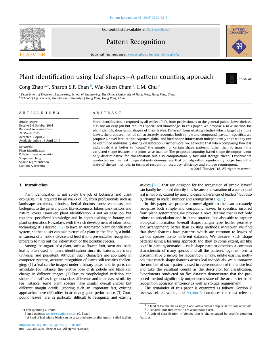在本文中,我们提出了一种新的算法,可以准确识别简单叶和复叶。在受到植物系统强度启发的特定项目中,我们提出了一种新颖的特征,它不仅能够稳定地进行接合处和平面内旋转,还能够比现有方法更好地捕获生物信息(整体形状,边缘类型,几何形状和排列)。此外,我们发现这些特征具有不同物种的叶子在不同数据集中共有的模式。我们使用学习方法发现这种形状模式,它们在某种程度上在植物系统学中像分类群一样--每个形状图案描述了许多物种的共同特征,并且所有图案一起形成识别的辨别原则。最后,与叶子个体中匹配形状特征的现有方法不同,我们总结了用于表示整片叶子这种模式的数量,并将得到的计数作为分类的描述符。在五个数据集上进行的实验表明,所提出的方法在识别准确性,效率和存储方面显着优于现有技术需求。