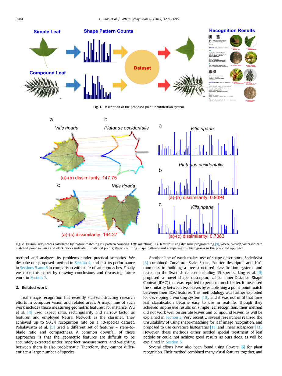 另一项工作是利用形状描述符。Soderkvist 结合曲率尺度空间,傅里叶描述符和Hu的时刻构建树状结构分类系统,并在包括15种物种的瑞典数据集上进行测试。凌等人提出了一种新颖的形状描述符,称为 Inner-Distance Shape Context(IDSC),据称它表现得更好。它通过在IDSC特性之间建立点-点匹配来测量两个叶子之间的相似性。该方法被进一步用于开发工作系统,直到那时叶子分类才变得容易在现实生活中使用。虽然它们在简单的叶片识别方面取得了令人印象深刻的成果,但它们的方法在锯齿状叶片和复叶片上效果不佳,这将在下文第3节中进行解释。最近,一些研究人员意识到不适合使用形状匹配进行叶片图像识别,并提出使用曲率直方图和线性子空间。然而,这些方法或者需要对叶柄进行特殊处理,而且不能像我们的那样获得好的结果,将在下文第5节中解释。