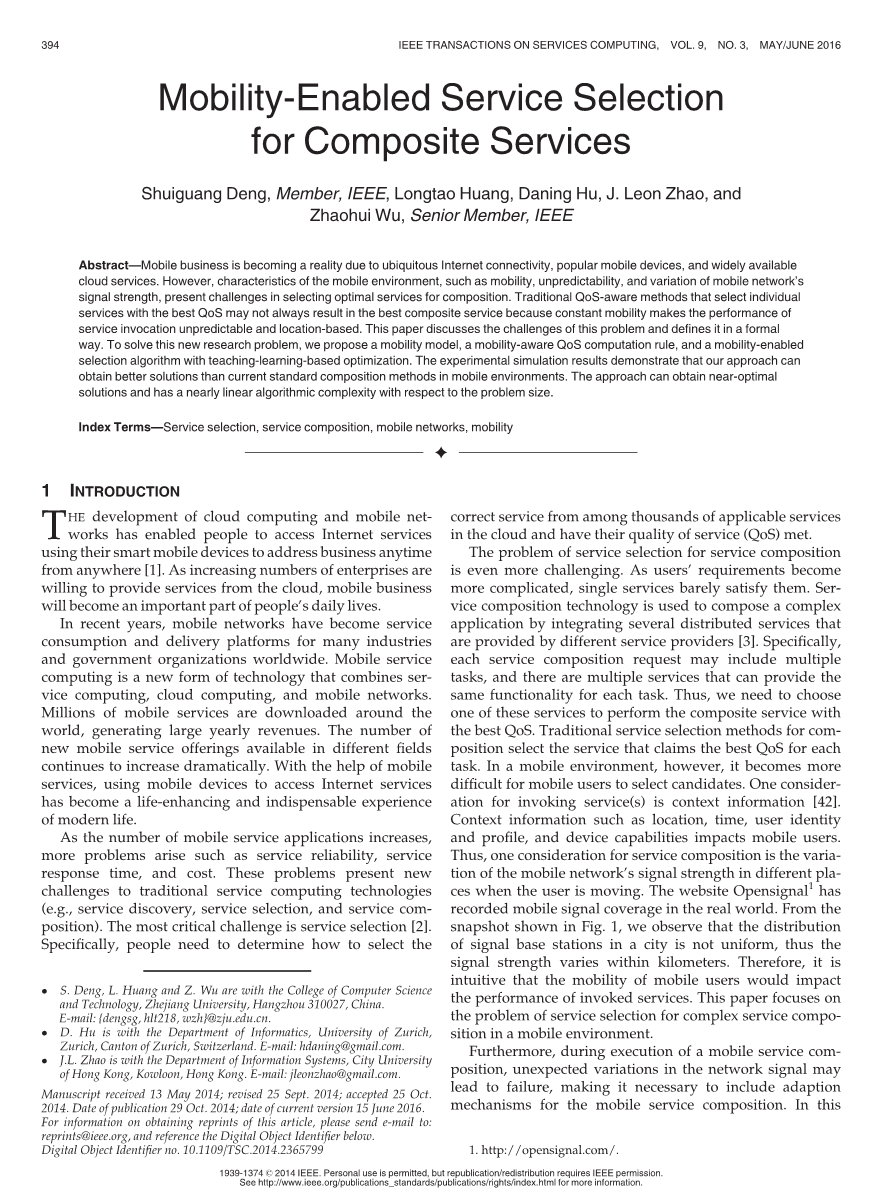 摘要—由于无处不在的互联网连接,移动设备的流行和广泛可用的云服务,移动业务正在成为现实。然而,由于移动环境的特性,例如移动性,不可预测性和移动网络信号强度的变化,使得在选择最佳服务方面仍存在挑战。选择具有最佳QoS的单个服务的传统QoS感知方法可能并不总是产生最佳的组合服务,因为持续的移动性使得服务调用的性能不可预测。本文对此问题的挑战进行讨论,并对其进行了正式的定义。为了解决这个新的研究问题,我们提出了一种移动性模型,一种移动性感知QoS计算规则,以及一种基于教学学习的优化的移动性选择算法。实验仿真结果表明,我们的方法可以获得比移动环境中当前标准组合方法更好的解决方案。该方法可以获得接近最优的解,并且在问题大小方面具有接近线性的算法复杂度。