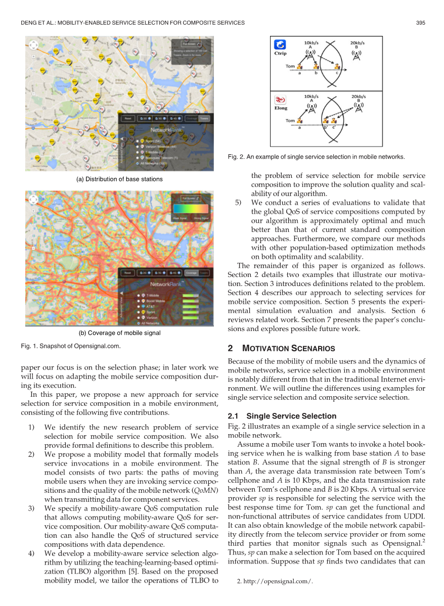 服务组合的服务选择问题更具挑战性。随着用户的需求变得更加复杂,单一服务几乎无法满足他们。服务组合技术被用来通过集成由不同服务提供商提供的多个分布式服务来组成复杂的应用程序[3]。具体来说就是每个服务组合请求可以包括多个任务,并且存在可以为每个任务提供相同功能的多个服务。因此,我们需要选择其中一种服务来执行具有最佳QoS的组合服务。用于组合的传统服务选择方法选择为每个任务声明最佳QoS的服务。然而,在移动环境中,对于移动用户选择服务就变得更加困难。调用服务的其中一个考虑因素就是是上下文信息[42]。上下文信息如位置、时间、用户身份信息以及设备的配置和功能等都会影响移动用户。因此,服务组合的其中一个考虑因素就是当用户移动时移动网络在不同位置的信号强度变化。Opensignal网站已经记录了现实世界中的移动信号覆盖情况。 根据图1所示的快照,我们观察到城市中信号基站的分布不均匀,使信号强度在千米以内变化。因此,移动用户的移动会直接影响被调用服务的性能。本文主要研究移动环境中复杂服务组合的服务选择问题。