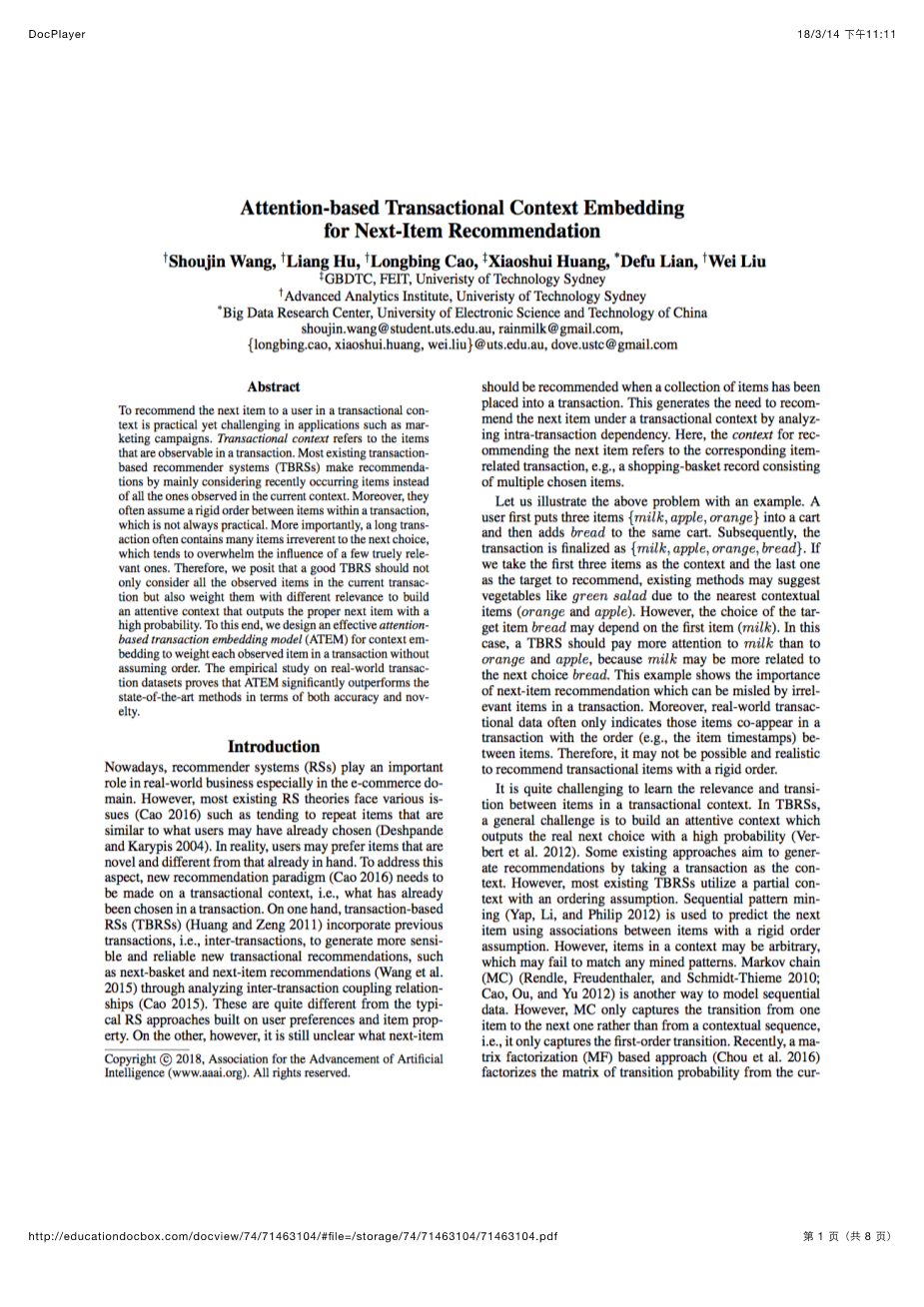在应用中,比如市场营销中,根据事务上下文为用户推荐下一个物品是很实用但具有挑战性的。事务上下文就是在事务中可见的物品。大多数现有的基于事务的推荐系统(TBRSs)主要考虑最近出现的物品而不是当前上下文中所有的物品来进行推荐。另外,他们总是设想一个事务的物品之间具有硬性的顺序排列,这并不实际。更为重要的是,一个较长的事务中经常包含了很多和用户的下一个选择无关的物品,它们对下一个选择的影响甚至会覆盖一些真正有关的物品的影响。因此,我们设想一个好的TBRS不应该只关注当前事务中的所有物品,而应该根据它们不同的相关性给它们赋予权重,以此构建具有注意力的上下文,并以更高的几率输出正确的下一个物品。为此,我们设计了一个有效的基于注意力的事务嵌入式模型(ATEM)用于嵌入上下文并为事务中的每个物品设置权重而不设想它们具有顺序。在实际事务数据集上的研究表明ATEM在准确度和新颖性方面显著优于目前最先进的算法。