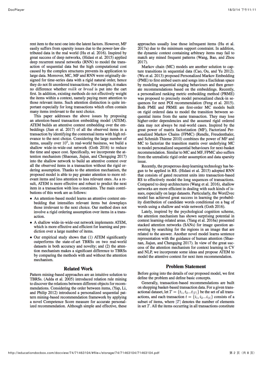 了解一个事务上下文中物品之间的相关性和过渡是一大挑战。在TBRSs中,一个普遍的挑战是如何构建一个具有注意力的上下文来更高几率地输出真实的下一选择。有些现有的方法致力于将事务作为上下文来产生推荐。然而,大多数现有的TBRSs使用具有顺序假设的部分上下文。序列模式挖掘被用于根据具有硬性顺序假设的物品间的联系预测下一个物品。但是,一个上下文中的物品可能是任意的,可能不符合任何的挖掘模式。马尔科夫链是另一种将时序数据建模的方法。然而,MC只获取一个物品和下一个物品之间的过渡而不是获取整个上下文序列中的,也就是说,它只获取一阶过渡信息。最近,一个基于矩阵因式分解(MF)的方法将从当前物品到下一个的过渡概率矩阵因式分解为潜在因子。然而,MF容易遇到矩阵稀疏问题,因为现实世界中的数据是呈幂率分布的。由于深度神经网络的巨大成功,应用深度循环神经网络来将带有序列数据的事务建模。但是由于复杂的网络导致了极大的计算代价,这种网络并不能处理大规模的数据。另外,MC,MF和RNN最先被设计用于具有硬性自然顺序的事件序列数据,因此它们不适用于乱序的事务。比如,牛奶和面包哪个先被放进购物车它是不作区分的。另外,现存的方法并为有效地为上下文中的物品设置权重,也就是说更关注那些相关的物品。这种注意力的区别相当重要,尤其对于那些包含了很多与下一个选择无关的物品的长事务。