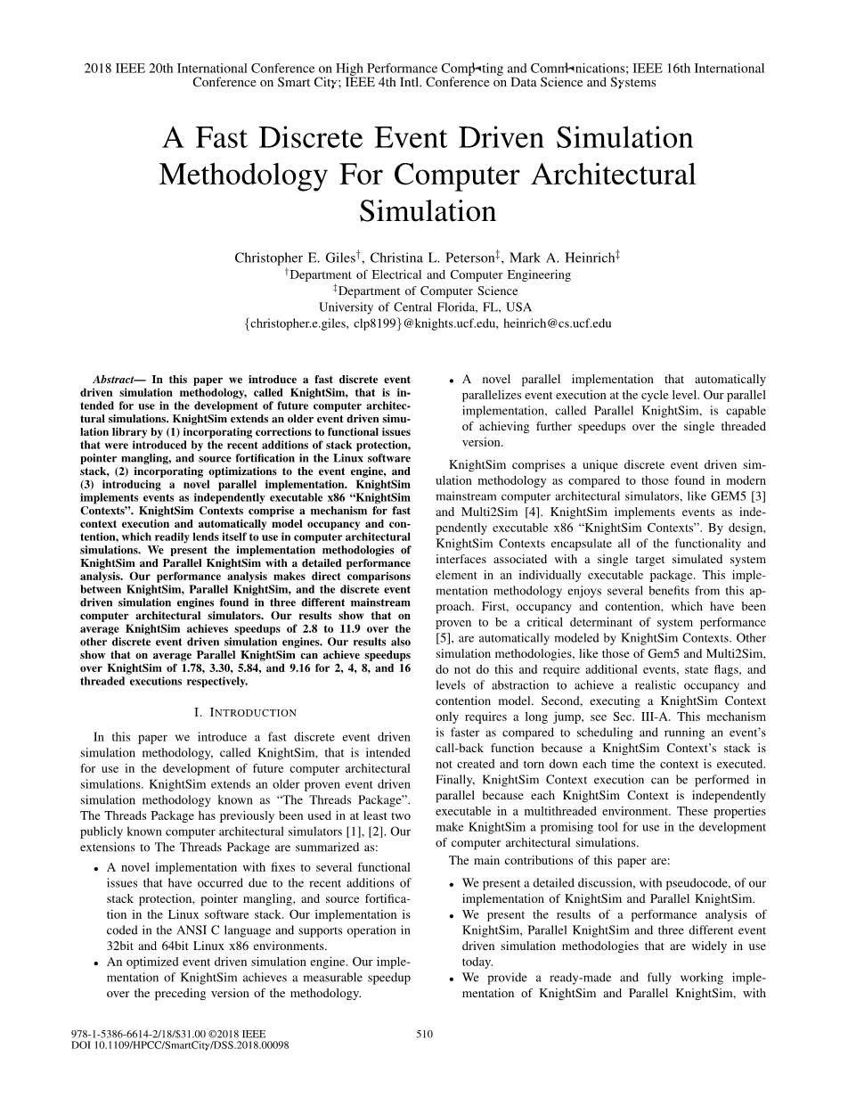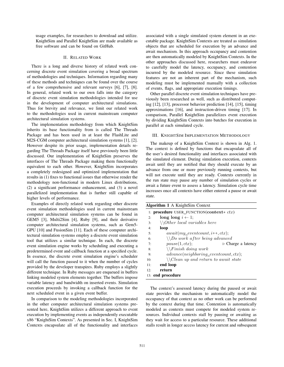 关于离散事件模拟的相关工作有着悠久而多样的历史,涵盖了广泛的方法和技术。关于许多这些方法和技术的信息可以在一些全面和相关的调查[6],[7],[8]的过程中找到。一般来说,我们自己的相关工作属于离散事件模拟方法的范畴。旨在用于计算机体系结构模拟的开发。因此,为了简洁和相关,我们将相关工作限制于当前主流计算机体系结构仿真系统中使用的方法。 KnightSim从中继承其基本功能的实现方法称为The Threads Package,至少已用于FlashLite和M2S-CGM计算机体系结构仿真系统[1],[2]。然而,尽管之前已经使用过,但之前很少讨论关于线程包本身的实现细节。我们对KnightSim的实现保留了The Threads Package的接口,使它们在功能上彼此等效。但是,KnightSim采用了完全重新设计和优化的实现,从而导致(1)修复了在现代Linux发行版中使方法无法正常运行的功能问题,(2)显着的性能增强,以及(3)新的并行化实现仍然能够