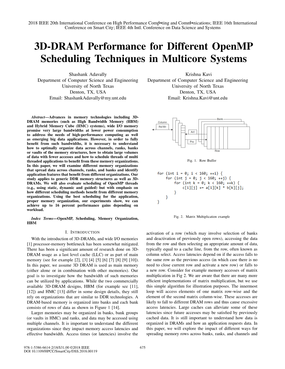 在多核处理器和许多核GPU的时代,高效的并行编程对于从这些系统中获益至关重要。为了我们的目的,我们将研究局限于同构多核系统,因此将重点放在OpenMP风格的程序上。由于程序员可能不知道DRAM结构(如上文所述),这些并行程序可能无法达到最佳性能水平。例如,很少有程序员在OpenMP中使用“schedule”子句(即,没有指定的调度类型),依靠运行时系统来实现调度。使用“schedule”子句,与不使用“schedule”子句相比,对总体性能造成最大3倍的特定工作负载影响。有些程序员使用静态块调度,将连续迭代的数字(即块)分配给同一线程。也可以使用其他方法将循环迭代分发给线程,包括循环地将迭代分配给线程(在这种情况下,可以将连续迭代分配给不同的线程)。在动态调度中,循环迭代块被分配给下一个空闲线程,这可能导致分配给不同线程的迭代次数不均匀。在引导式调度中,最初只有一部分(通常是一半)的工作被分配给线程,当分配的工作完成时,迭代的另一部分被分配,直到所有的工作都完成。这种调度类型可以减少块的大小,以提高迭代之间的负载平衡。最后,当指定auto时,迭代调度分配由编译器控制。虽然循环迭代的循环分配通常不用于动态和引导式调度方法,但我们在本研究中探讨了此类分配。显然,使用的调度会影响应用程序的性能,因为不同的调度方法会导致不同的内存访问模式。我们的目标是定量测量由于线程调度和DRAM内存结构导致的性能差异。在某些情况下,来自不同线程的访问会落在同一个DRAM行中,而在其他情况下,它们落在不同的DRAM行中。DRAM行的大小和分布会影响访问延迟。本文主要研究两种不同的迭代分布方法(分块和循环),三种调度方法(静态、动态、引导)和两种DRAM结构。在前面研究了OpenMP调度对性能的影响的同时,重点研究了不同内存结构的调度方法对内存访问的影响。我们还研究了这些结构和有序和无序核心的调度方法,因为PIMS可能会在有序核心中使用。