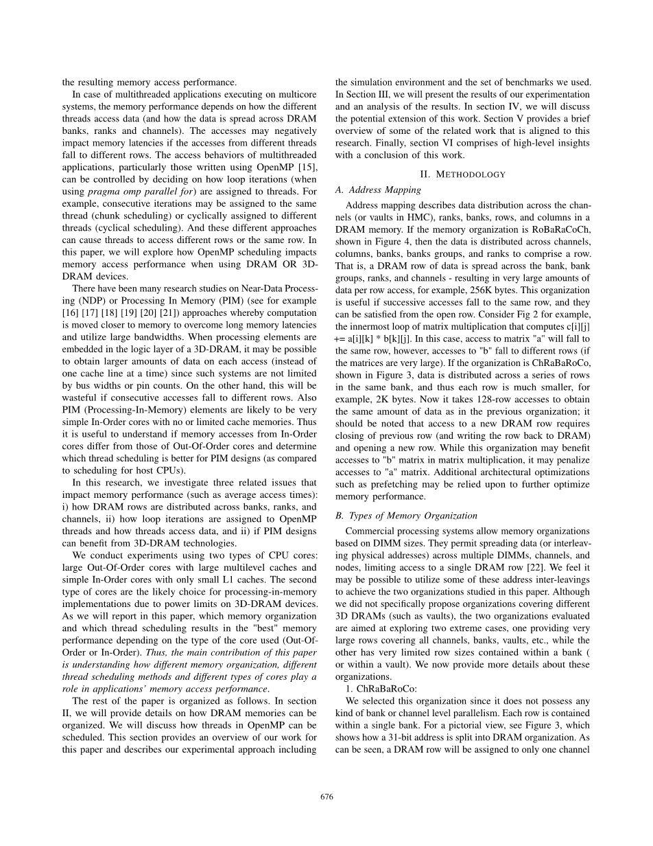 论文的其余部分结构如下。在第二节中,我们将详细介绍如何组织DRAM内存。我们将讨论如何调度OpenMP中的线程。本节概述了本文的工作,并介绍了我们的实验方法,包括我们使用的模拟环境和基准集。在第三节中,我们将介绍我们的实验结果和结果分析。在第四节中,我们将讨论这项工作的潜在扩展。第五节简要概述了与本研究相关的一些工作。最后,第六节包含了对这项工作的总结的高层次见解。