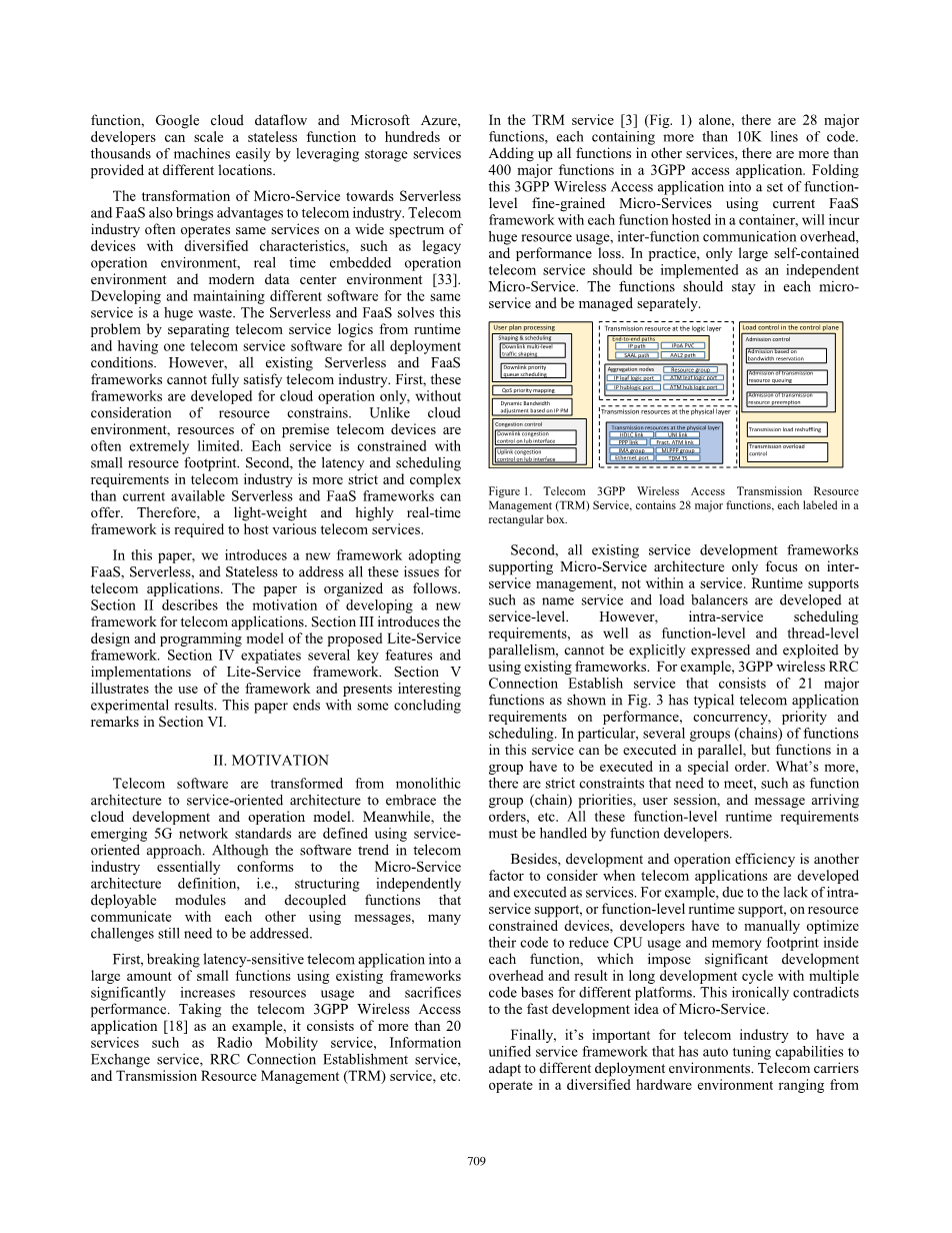 首先,使用现有框架将对延迟敏感的电信应用程序分解为大量的小功能,这将显著提高资源使用率并牺牲性能。以电信3GPP无线接入应用[18]为例,它由无线移动业务、信息交换业务、RRC连接建立业务、传输资源管理(TRM)业务等20多个业务组成。仅在TRM服务中(图1),就有28个主要功能,每个功能包含超过10000行代码。将其他服务中的所有功能相加,3gpp访问应用程序中有400多个主要功能。使用当前FaaS框架将3gpp无线访问应用程序折叠成一组功能级细粒度微服务,每个功能都位于一个容器中,这将导致巨大的资源使用、功能间通信开销和性能损失。在实践中,只有大型的自备电信业务才能作为一种独立的微业务来实现。这些功能应保留在每个微服务中,并单独管理。