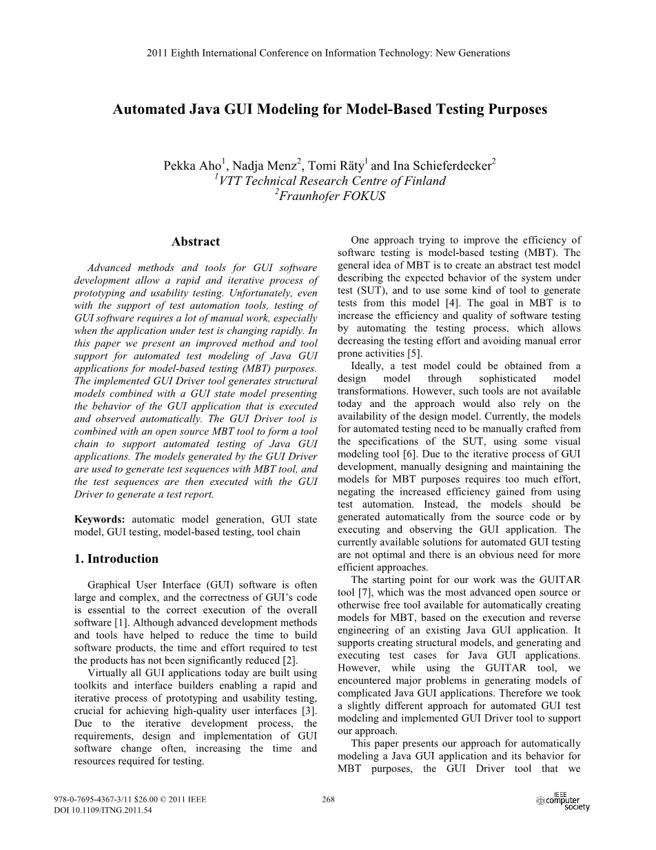 我们工作的出发点是GUITAR工具[7],它是最先进的开源或其他免费工具,可用于基于现有Java GUI应用程序的执行和逆向工程自动创建MBT模型。它支持创建结构模型,以及为Java GUI应用程序生成和执行测试用例。然而,在使用GUITAR工具时,我们在生成复杂Java GUI应用程序时遇到了大问题。于是,我们对自动化GUI测试采用了略微不同的方法,并实现了GUI驱动程序工具来支持我们的方法。本文介绍了我们自动创建Java GUI应用程序模型的方法。同时介绍了它的MBT行为,我们为支持我们方法而实现的GUI驱动程序工具,以及通过将GUI驱动与一个开源MBT工具结合来支持Java GUI应用程序的工具链。我们的目标是减少创建和维护测试模型所需的工作,并提高Java GUI应用程序自动化测试的效率。