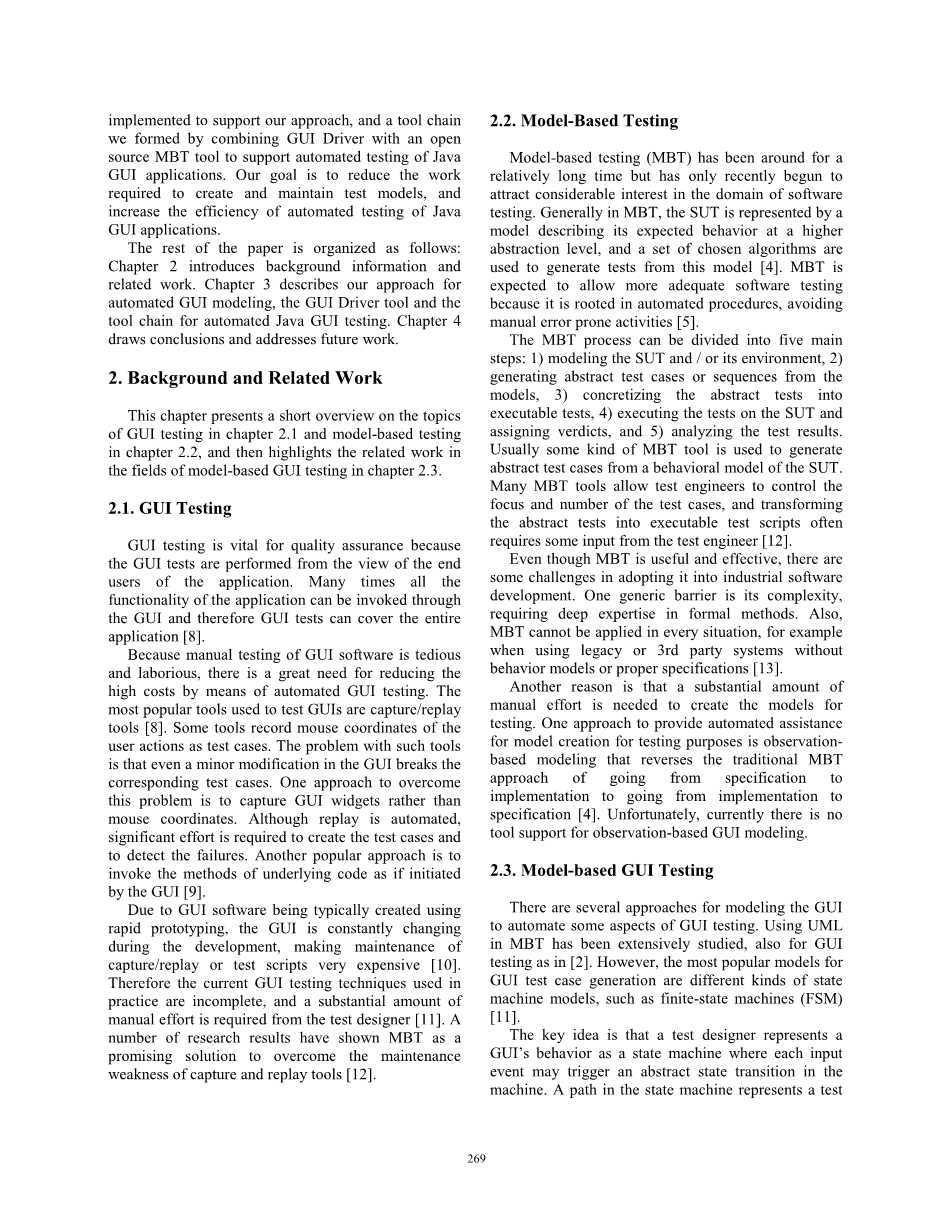 本文的其余部分安排如下:第二章介绍了背景信息和相关工作。第三章介绍了我们的自动化建模方法,GUI驱动程序工具和自动化Java GUI测试的工具链。第四章得出结论并解决未来的工作。