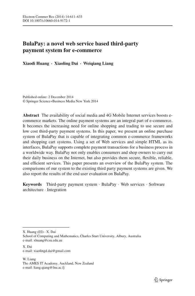 摘要 社交媒体和 4g 移动互联网服务的可用性促进了电子商务市场。在线支付系统是电子商务的一个组成部分。使用安全、低成本的第三方支付系统成为网购和交易日益增长的需求。本文提出了一种能够集成通用电子商务框架和购物车系统的 BulaPay 网上购物系统。使用一组 Web 服务和简单的 HTML 作为接口,BulaPay 以全球范围的方式支持业务流程的完整支付事务。BulaPay 不仅使消费者和店主能够在互联网上开展日常业务,而且还为他们提供安全、灵活、可靠和高效的服务。本文概述了 BulaPay 系统,并对我国现有的第三方支付系统进行了比较。我们还报告 bulalpay 最终用户评估的结果。