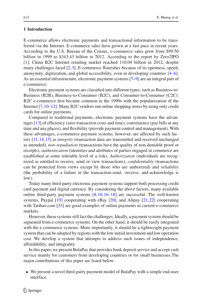 电子商务允许电子支付和交易信息通过互联网进行传输。近年来,电子商务销售增长速度很快。根据美国人口普查局的数据,电子商务销售额从 1999年的 995亿美元增长到 2012年的 3434.3亿美元。根据清科的报告 [1],尽管面临许多挑战,2012年中国B2C互联网零售市场仍达到110.04亿美元[2,3]。电子商务因其开放性,速度,匿名性,数字化和全球可访问性而蓬勃发展,即使在发展中国家也是如此[4-6]。作为基础设施,电子支付系统 [7-9] 是电子商务的一个组成部分。