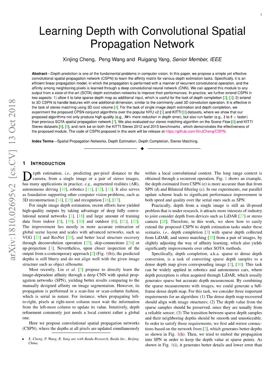 1) 我们提出了卷积空间传播网络(CSPN),它在不牺牲理论上的可靠性的前提下,比以前的SOTA传播策略对深度有更有效和准确估计 [7],。