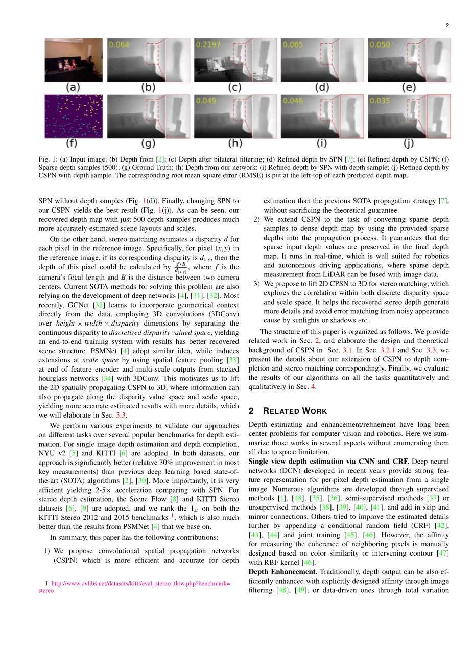 图1:(a)输入图像;(b)[2]的深度;(c)双边过滤后的深度;(d)SPN精确深度[7];(e)CSPN的精确深度;(f)稀疏深度样本(500);(g)地面真相;(h)深入我们的网络;(i)SPN对深度样本的精确深度;(j)CSPN对深度样本的精确深度。cotTesponding均方根误差(RMSE)放在每个预测深度图的左上角。