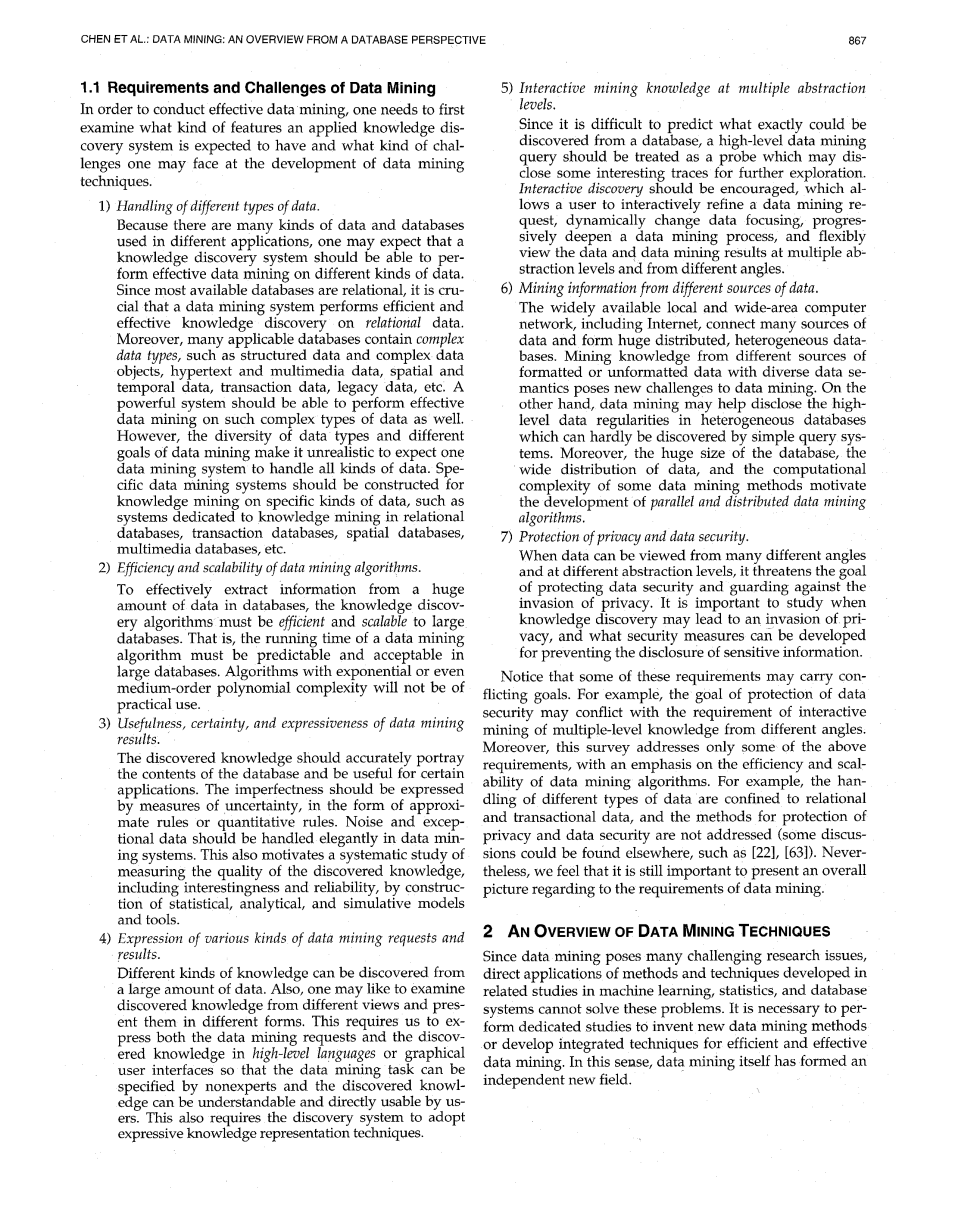 注意到这些需求中的一些可能会存在冲突,比如,保护数据安全的目标可能会与从不同角度交互式挖掘多层级知识的要求冲突。此外,这篇概述只涉及上述需求中的一部分,主要强调数据挖掘算法的效率和可扩展性。例如,不同类型数据的处理局限于关系数据和事务数据,保护隐私和数据安全的方法则没有涉及(有关的讨论可以在其他文献中找到,比如参考文献[22],[63])。尽管如此,我们觉得展现数据挖掘需求的总体情况依然十分重要。