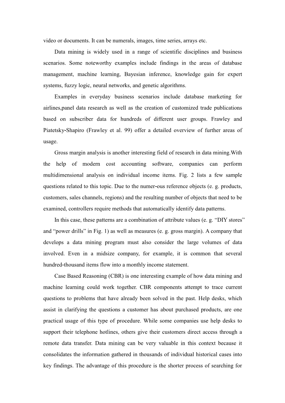 数据挖掘是广泛用于一系列科学学科和业务场景。一些值得注意的例子:管理、机器学习贝叶斯-伊恩推理、知识获得专家系统、模糊逻辑、神经网络和遗传算法。在日常业务场景的例子:包括航空公司、数据库营销面板数据的研究和创造,基于定制的贸易出版物为数百种不同的用户数据用户组。Piatetsky-Shapiro与相关学术人员在99年提供一个详细的进一步的使用领域的概述。是另一个国际米兰——毛利分析美国东部时间在数据挖掘领域的研究。现代成本会计的帮助下软件公司可以对个人所得税进行多维分析物品。由于大量引用(e.g.产品客户托马、销售渠道、区域)和需要的对象的数量检查控制器需要方法自动识别数据模式。在这种情况下,这些模式的组合属性值(e . g。“DIY商店”和“力量训练”)以及(e . g .毛利率)措施。一个公司,开发数据挖掘程序必须也考虑到大量数据参与。即使在一个中型公司是很常见的,成百上千项流入每月损益表。基于案例的推理(CBR)是其中之一数据最小的有趣的例子荷兰国际集团(ING)和机器学习在一起。CBR组件尝试跟踪当前问题的问题已经解决了过去。帮助桌子,协助澄清的问题客户有购买产品,是一个实际的使用类型的过程。尽管一些公司使用帮助台支持他们的电信电话热线,其他人给他们定制-人通过远程数据的直接访问转移。可以非常价值——数据挖掘在这种情况下,因为它巩固聚集在成千上万的信息关键的发现——个人历史病例老年男性。这种方法的优点是较短的过程,寻找先例可以用来回答当前客户的问题。