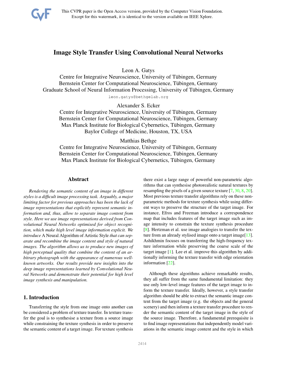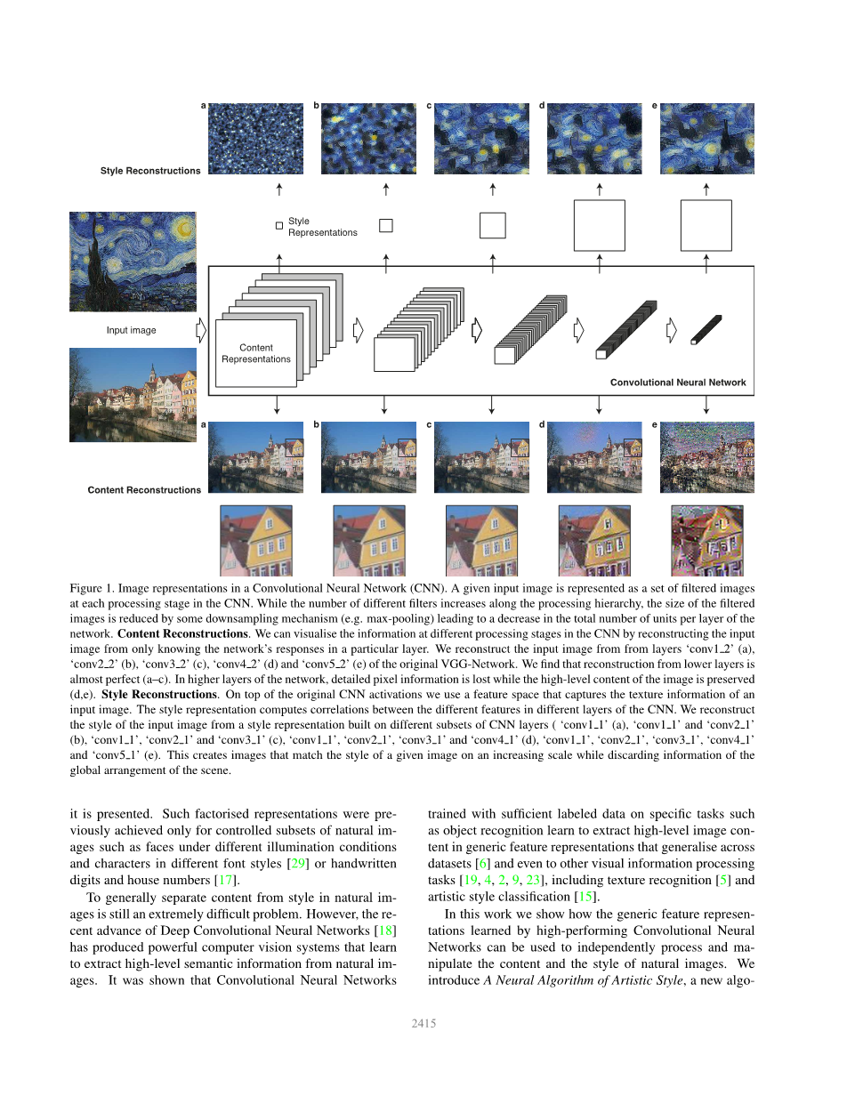 将图像的内容从风格中分离开的通用方法仍然是一个非常困难的问题。然而,最近深度卷积神经网络的进步产生了一些强大的计算机视觉系统,可以学习从自然图像中提取高层语义信息。采用充足标注的数据训练的卷积神经网络在特定任务中,比如物体识别,在一般的特征表示中学习提取高层图像内容,可以在数据集上泛化[6],甚至也可以应用于其他视觉信息处理任务[19, 4, 2, 9, 23],包括纹理识别[5]和艺术风格分类[15]。
