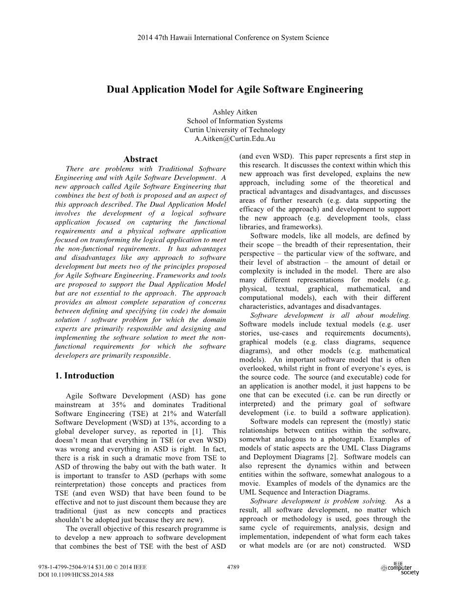 传统的软件工程和敏捷软件开发都存在着一些问题。本文提出了一种被称为敏捷软件工程的新方法,该方法结合了传统的软件工程和敏捷软件开发的优点,同时,本文将描述该方法的一个方面。双重应用程序模型涉及到逻辑软件应用程序和物理软件应用程序的开发,前者侧重于捕获功能性需求,后者侧重于转换逻辑应用程序以满足非功能性需求。和所有的软件开发方法一样,该方法拥有自己的优点和缺点,但是它满足敏捷软件工程中提出的两个原则。本文提出了支持双重应用程序模型的框架和工具,但它们对于该方法而言并不是必需的。该方法在领域解决方案/软件问题的定义说明(通过代码)和实现软件解决方案以满足非功能性需求之间提供了一个几乎完全分离的关注点,前者主要由领域的专家负责和设计,后者主要由软件开发人员负责。