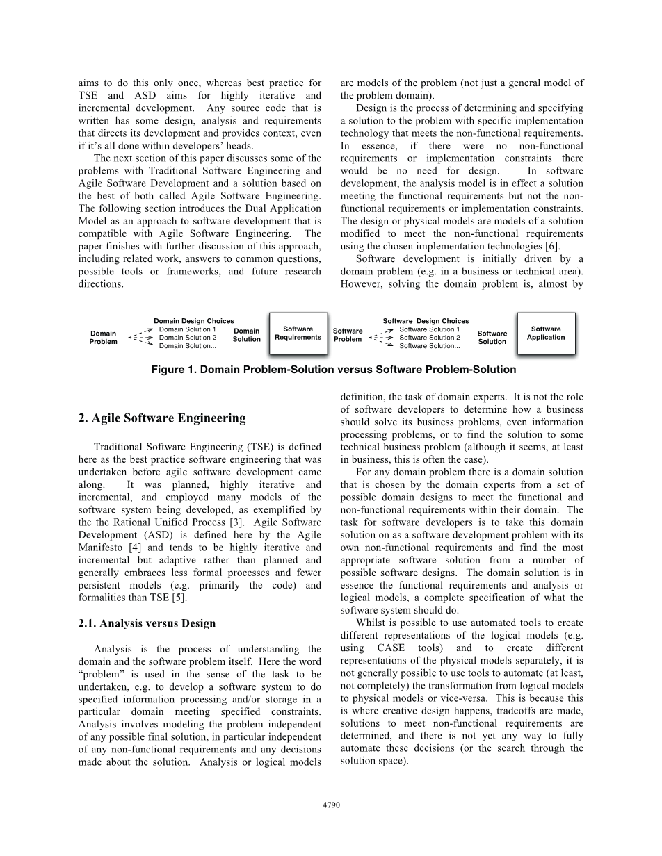 本文的下一节将讨论传统软件工程和敏捷软件开发中的一些问题,以及基于两者优点的一种解决方案,即敏捷软件工程。之后的一节将介绍双重应用模型作为一种与敏捷软件工程兼容的软件开发方法。本文最后对该方法进行了进一步的讨论,包括相关工作、常见问题的解答、可能的工具或框架以及未来的研究方向。