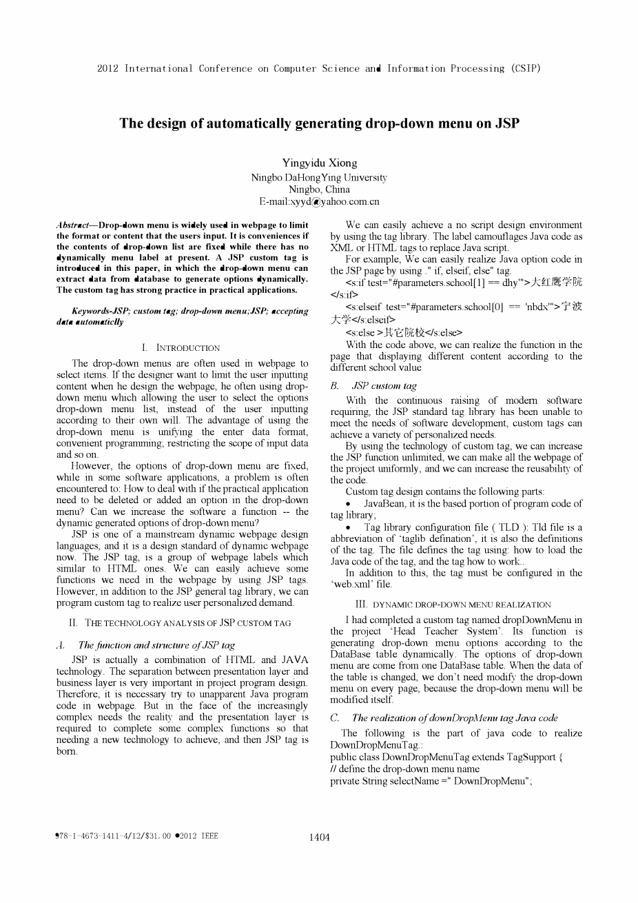 摘要 - 下拉菜单广泛用于网页,如果是方便的话以限制用户输入的格式或内容。当前没有动态菜单标签时,下拉列表的内容是固定的。 JSP自定义标记是本文介绍了下拉菜单,可以从数据库中提取数据以动态生成选项。自定义标签在实际应用中具有很强的实践性。