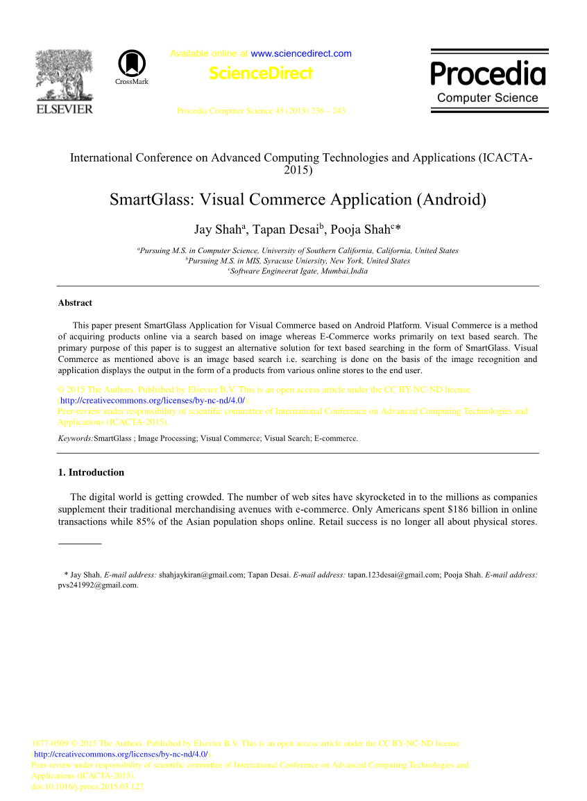 Jay Shah et al. / Procedia Computer Science 45 (2015) 236 – 243 |