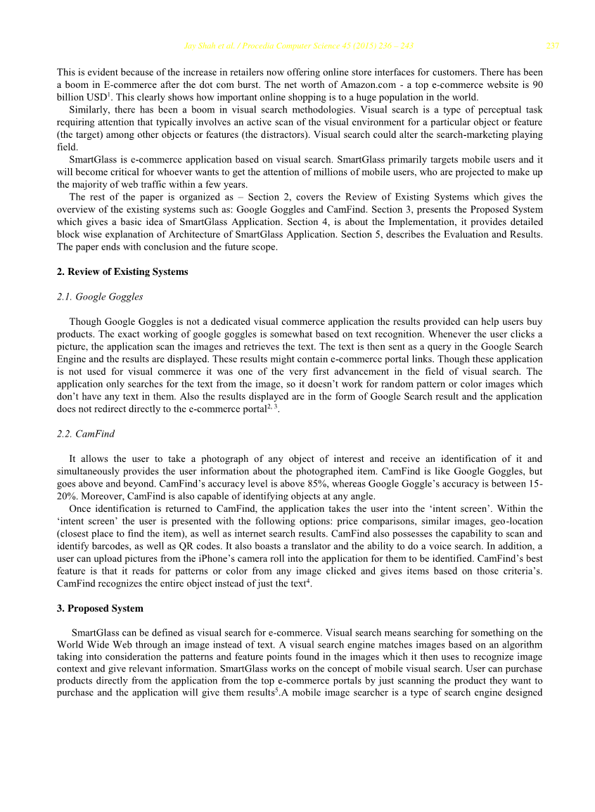 SmartGlass可以定义为电子商务的可视化搜索。视觉搜索意味着通过图像而不是文本在万维网上搜索某些内容。视觉搜索引擎基于算法匹配图像,其考虑在图像中找到的图案和特征点,然后其用于识别图像上下文并给出相关信息。SmartGlass致力于移动视觉搜索的概念。用户可以直接从顶级电子商务门户网站购买产品,只需扫描他们想要购买的产品,然后应用程序就会给出结果5。移动图像搜索器是一种设计的搜索引擎