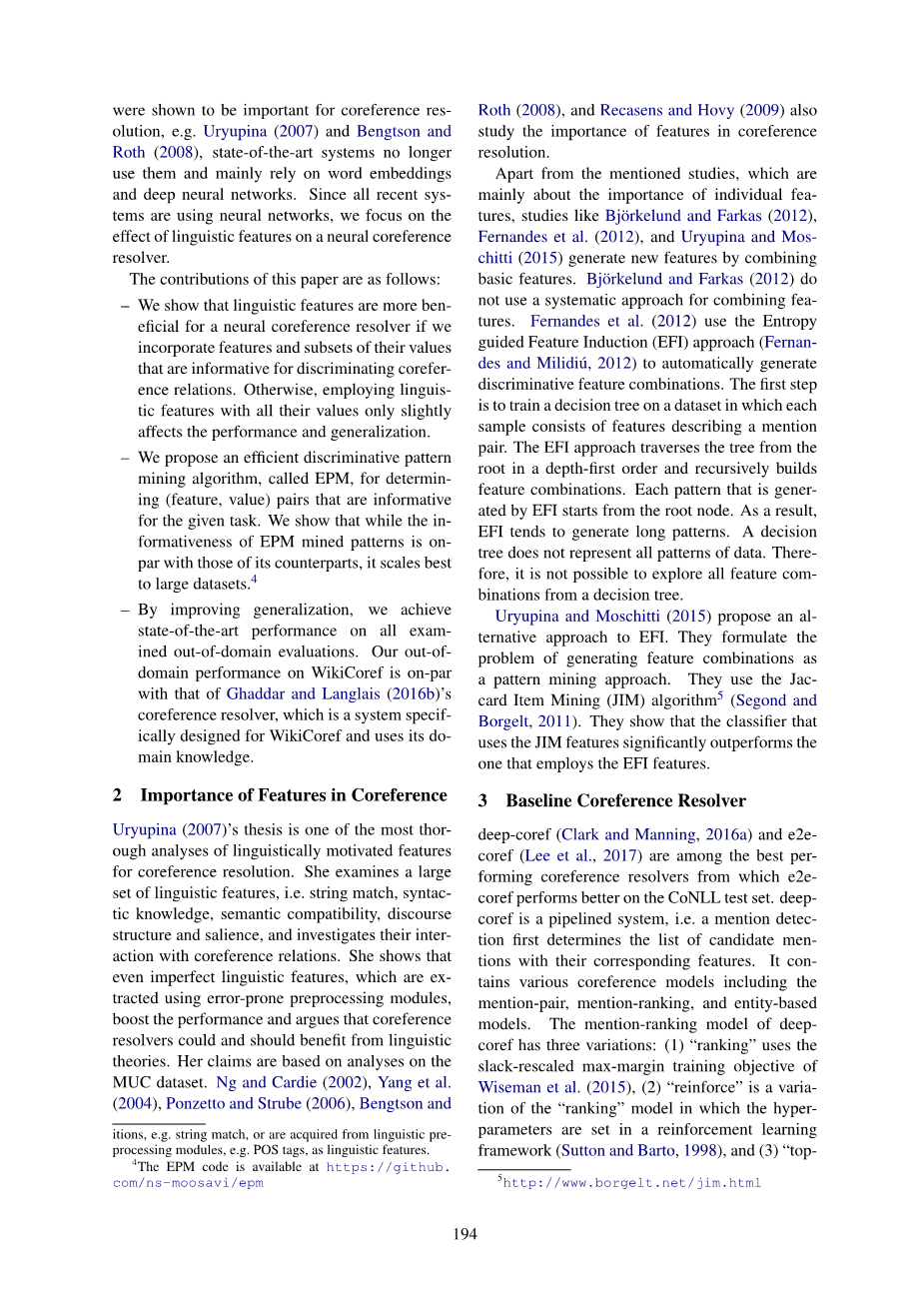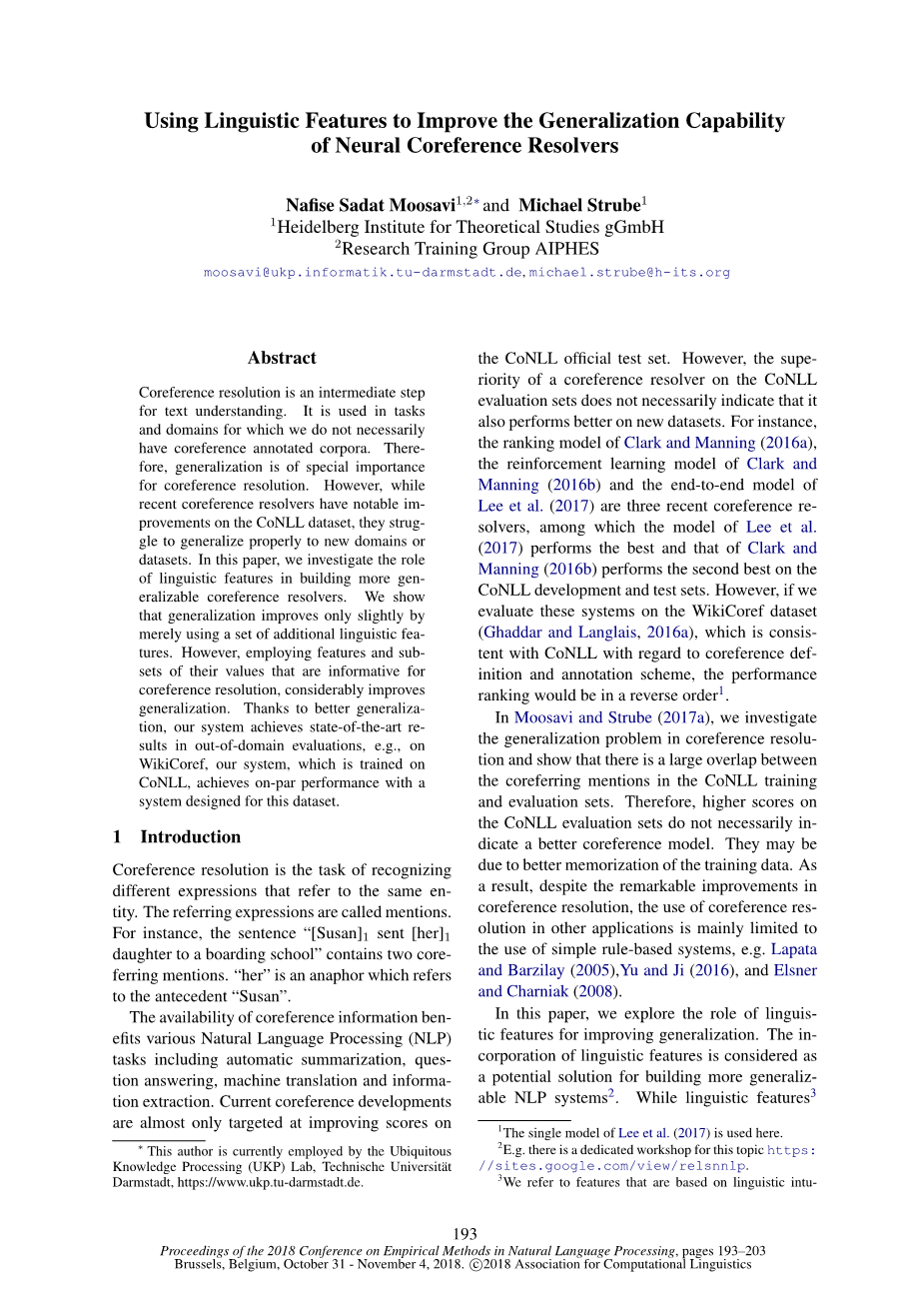 在Moosavi和Strube(2017a)中,我们研究了共指消解中的泛化问题,发现共指消解中的共指消解与共指消解集合中的共指消解有很大的重叠。因此,在conll评估集上的较高分数并不一定意味着一个更好的共指模型。这可能是因为更好地记忆了训练数据。因此,尽管共指消解有显著的改进,但在其他应用中,共指消解的使用主要局限于简单的基于规则的系统的使用,如Lapata和Barzilay(2005年)、Yu和Ji(2016年)、Elsner和Charniak(2008年)。