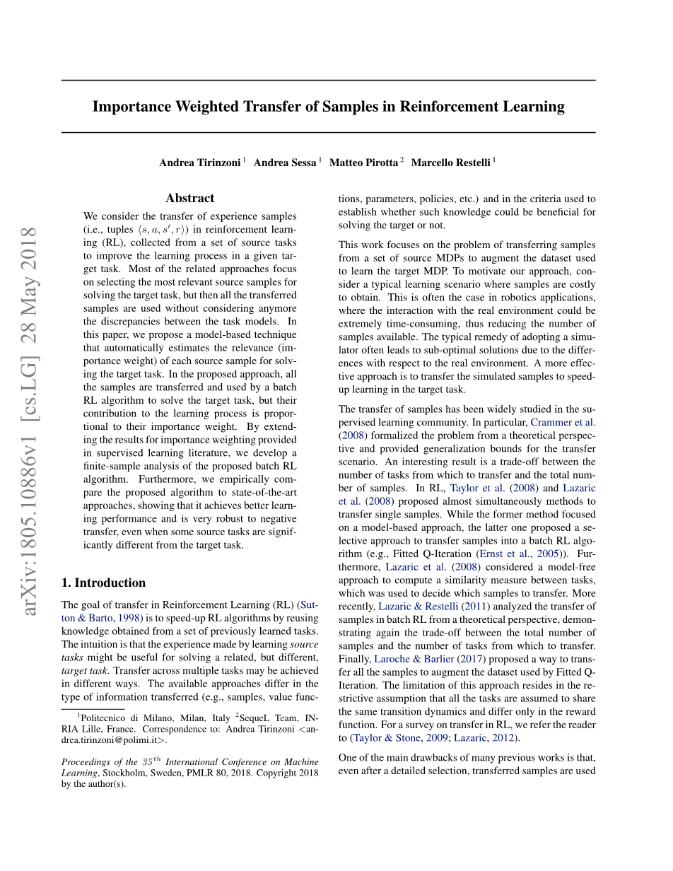 在强化学习中,我们为了改进给定目标任务的学习过程,考虑经验样本即从一组源任务中收集的元组的转移。大部分相关的方法都集中在为了解决目标任务而选择最相关的源样本,但是之后使用所有迁移的样本都不再考虑任务模型之间的差异。在这篇文章中,我们提出了一种基于模型的技术,可以自动估算每个源样本的相关性(权重)以解决目标任务。在提出的该方法中,所有的样本都通过批量强化学习算法迁移和使用来解决目标任务,但是它们对学习过程的贡献与它们的权重成正比。通过扩展监督学习文章中提供的加权结果,我们开发了一种有限样本分析的批量强化学习算法。此外,我们将所提出的算法与最先进的方法进行了实证比较,结果表明,该算法具有更好的学习性能,并且在某些源任务与目标任务显著不同的情况下,对负迁移也具有很强的鲁棒性。