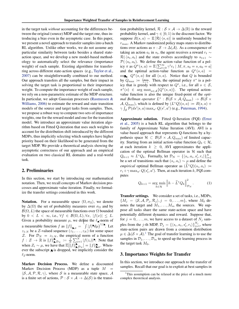 以往许多工作的主要缺点之一是,即使经过详细的选择,在目标任务中使用迁移样本也没有考虑到原始(源)MDP与目标MDP之间的差异,因此即使在渐近情况下也会引入偏差。在这篇文章中,我们提出一种将样本转化为批量强化学习算法的新方法。与其他作品不同的是,除了一个共享的状态动作外,我们不假定任务之间有任何特定的相似性,我们开发了一种新的基于模型的方法来自动选择每个样本的相关性(权重)。现有的迁移算法跨越不同的状态动作空间(例如Taylor等人2007年),可以直接结合到我们的方法中。我们的方法迁移了所有的样本,但是它们在解决目标任务中的影响与它们的权重成正比。为了计算每个样本的权重,我们依赖于MDP结构的非参数估计。特别地,我们采用高斯过程(Rasmussen和Williams,2006年)估计来自样本的源任务和目标任务的奖赏和状态转换模型。然后,我们提出一种健壮的方法来计算两组权重,一组用于奖赏模型,一组用于转换模型。我们引入了一种基于Fitted Q-Iteration的近似值迭代算法,该算法利用这些权值考虑不同MDPs引入的分布转移,从而隐式地根据从目标MDP生成的可能性选择优先级更高的样本。我们提供了一个理论分析,表明我们的方法的渐近正确性和对两个经典强化学习域的实证评估和一个实际任务。