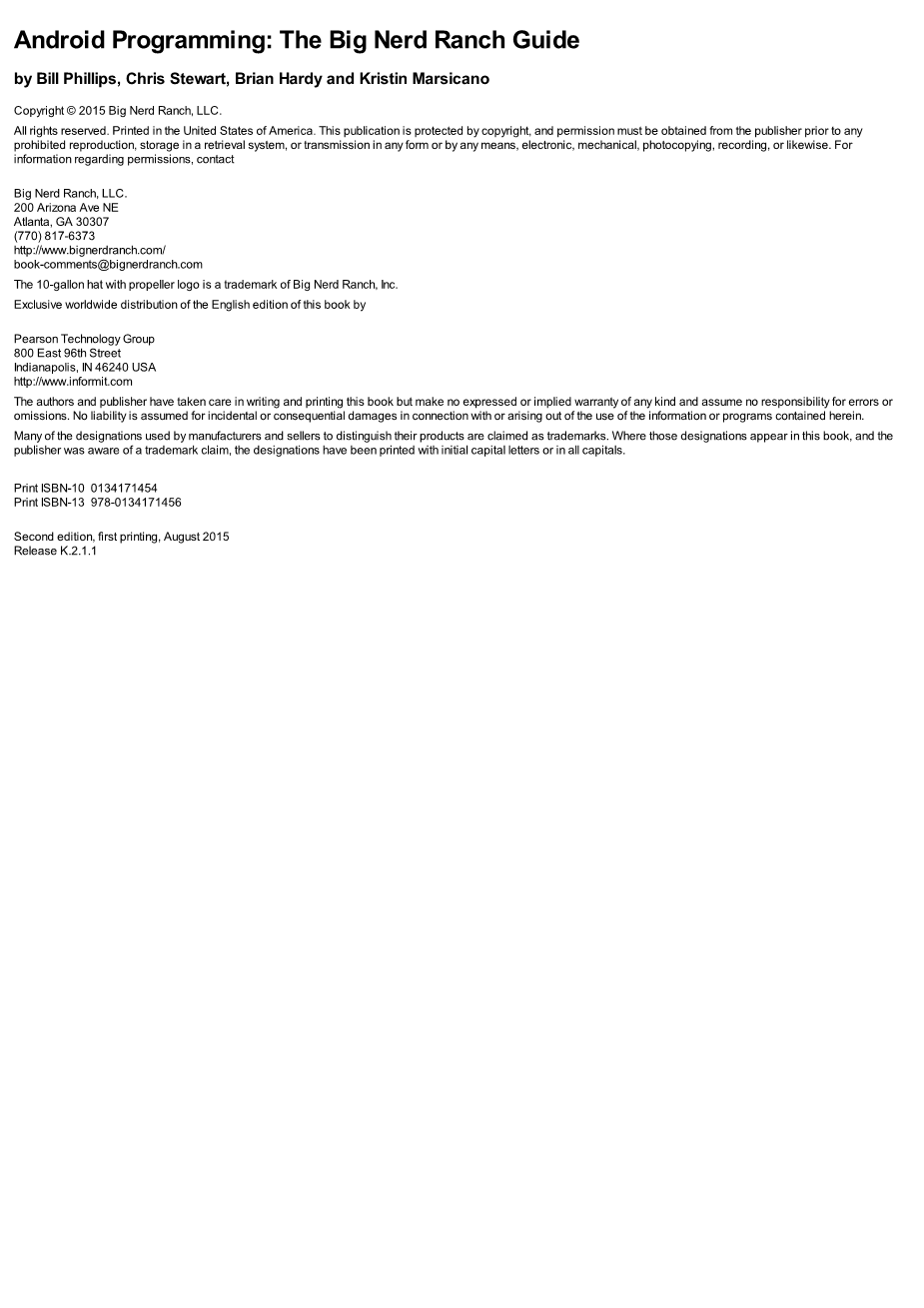 第一章充满了新概念而且需要建立一个Android应用。到了章节末尾如果你还不能理解所有东西也没关系。在你浏览整本书的时候,你还会见到它们,同时伴随着更多的细节。