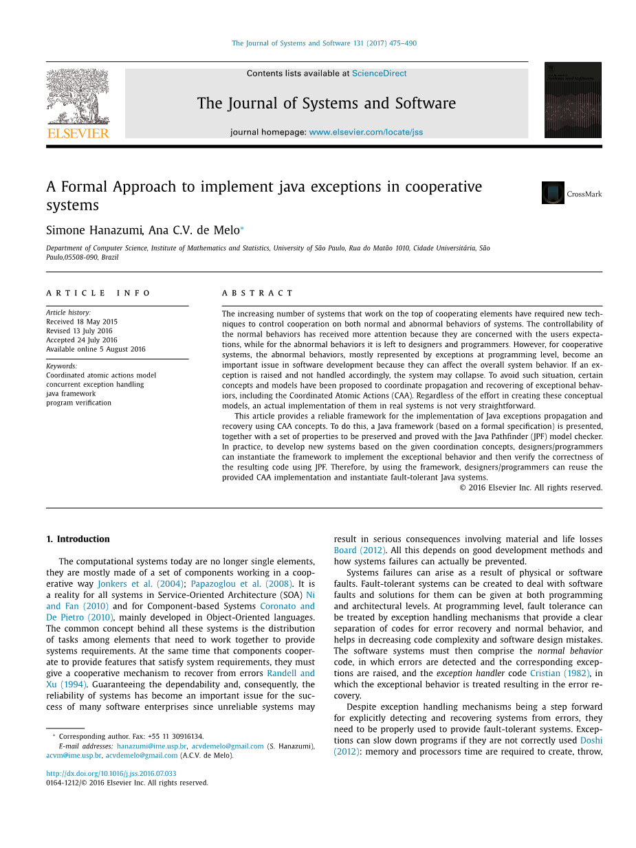 在并发和分布式系统中协调容错成为过去几年中许多研究的关键问题。 施托勒和施耐德施托勒和施耐德(2005) 提出了一种自动分析分布式系统容错的方法。 为了进行分析,它们用消息流图来表示系统行为,并使用这种表示来检查系统使用他们开发的框架的可靠性。 佐尔佐和斯特劳德Zorzo和Stroud(1999) 侧重于多方交互的概念以及这些交互的参与者应该如何在一个或多个组件发生故障的情况下做出反应。 为了支持他们的方法,他们实现了一个Java框架DRIP,它建立了一个抽象机制,放置在一个事务性系统之上,为分布式系统中的竞争性并发提供支持。 关于分布式系统中的检查点和恢复策略,已经提出了用于系统组件和协调协议之间的通信的新方法Park and Yeom(2000); Li(2006年)。 关于异构分布式系统中的容错问题,Wang和Wang明斯基 王和明斯基(2014) 和Cabello等人 Cabello等人 (2014)提出了处理系统故障的方法 上下文。 其他工作涉及架构层面的容错协调穆罕默德和祖尔克宁(2010) 并在dif-不同的范围,如多代理系统 Faci等人。 (2006年); 库马尔和科恩(2000)。 在目前的工作中,我们关注并发 Java系统,并希望选择一个适当的概念模型来处理一个或多个组件中的故障,从而促使我们选择协调原子行动(CAA)模型Xu等人 (1995年).