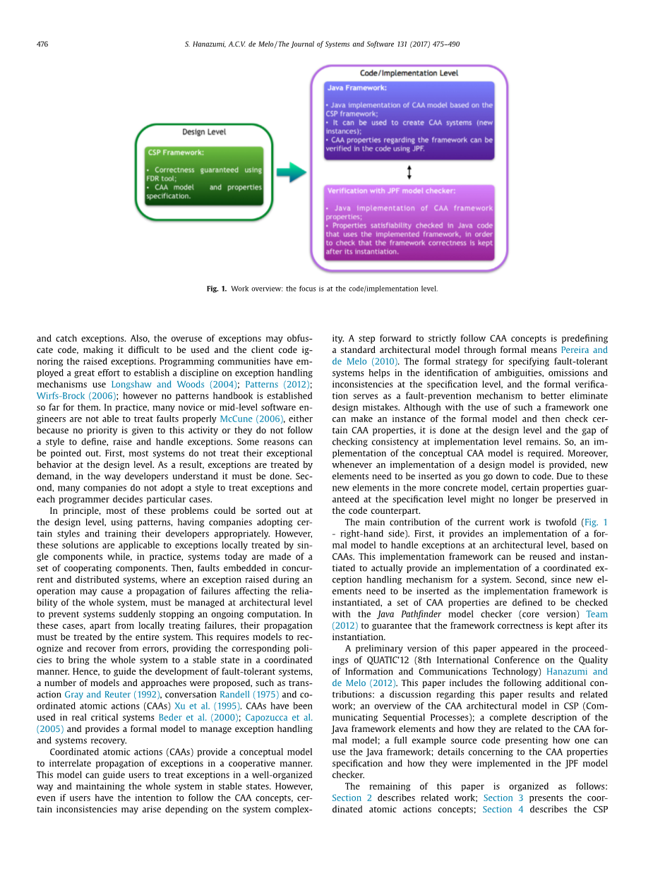 和斯特劳德Zorzo和Stroud(1999) 和Romanovsky、 Capozucca。 (2006年) 提出了适用于Java系统的实现模型,旨在帮助处理异常的程序员,我们的工作在某些方面与他们的工作不同。 首先,我们的Java框架基于CSP规范Pereira和de Melo(2010)。 人们可以通过实例化CSP co- 使用FDR工具的协调模型和原因FDR2(2012)。 由于我们的Java协调框架已被创建为其正式副本的“模拟”,系统实现可以通过类似的实例获得。 然而,在规范和代码级别的实例化需要不同的元素,并且在代码级别的验证对于保证协调机制仍然是必需的。 使当前工作与其他工作不同的第二个方面是使用JPF在代码级别(Java)检查CAA属性的可能性,因为某些CAA属性也在此定义。