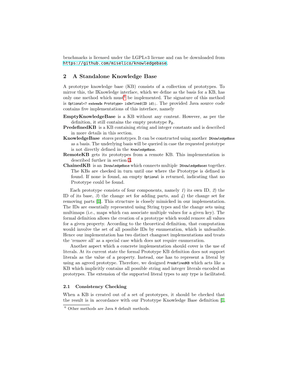 原型知识库(KB)由一系列原型组成.为了反映这一点。IKnowledge接口被我们定义为KB的基础,只有一个必须实施的方法。此方法的签名是可选的lt;? extends Prototypegt; isDefined(ID id);。提供的Java源代码包含这个接口的五个实现,即