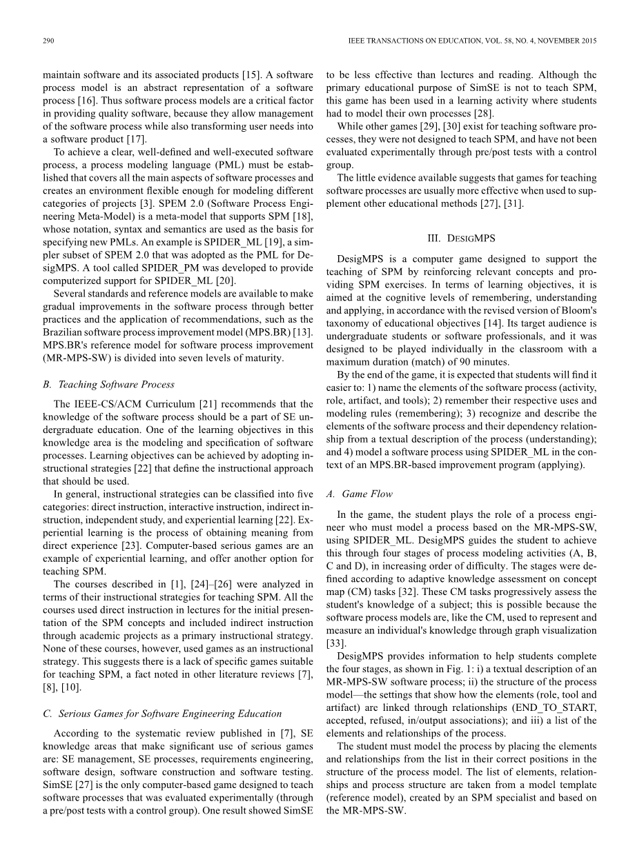 DESIGMPS是一种计算机游戏,旨在通过强化相关概念和提供SPM练习来支持SPM的教学。在学习目标方面,它针对的是记忆,理解和应用的认知水平。并根据布鲁姆的教育目标分类的修订版[14]。它的目标受众是本科生或软件专业人员,它被设计成在课堂上单独播放,最长时间为90分钟。
