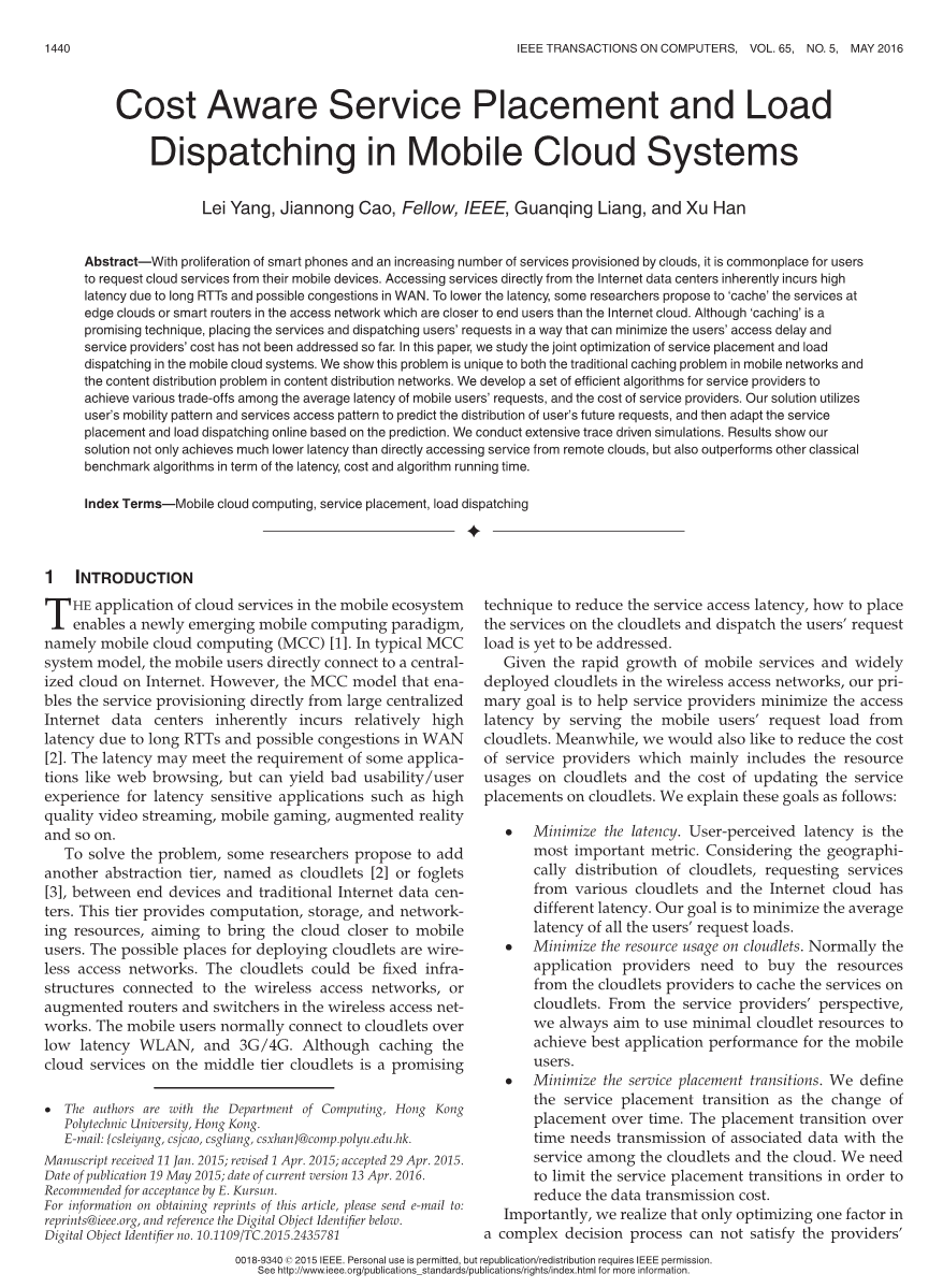 随着智能手机的激增和越来越多的云服务,用户在移动设备端请求云服务是很普通的一件事。从互联网数据中心直接获取数据会导致极高的延迟,由于长的往返时延(RTT)和广域网的可能的拥塞。为了降低时延,一些研究者提出把服务缓存在边缘云或者是在更接近于终端用户而不是互联网云的智能路由器上。尽管缓存是一个理想的技术,但是,最小化用户获取延迟和服务提供商的成本来放置服务和调度用户的需求不会很远了。在这片论文中,我们研究了在移动云系统中的服务部署和负载调度的联合优化。我们认为这个问题对传统的移动网络的缓存问题和内容分布式网络的内容分配是独特的。我们为服务提供商开发了一系列有效的算法来达到在移动用户要求的平均延迟的协定,和服务提供商的成本。我们的解决方案使用了用户移动模式和服务访问模式来预测用户未来的需求分布,之后基于这些预测来适应性在线进行的服务部署和负载调度。我们通过仿真实施了广泛的追踪。结果显示我们的解决方案不仅达到了比直接从远程云中获取服务更低的延迟,也在延迟、成本和算法运行时间上胜过其他的经典的基准算法。